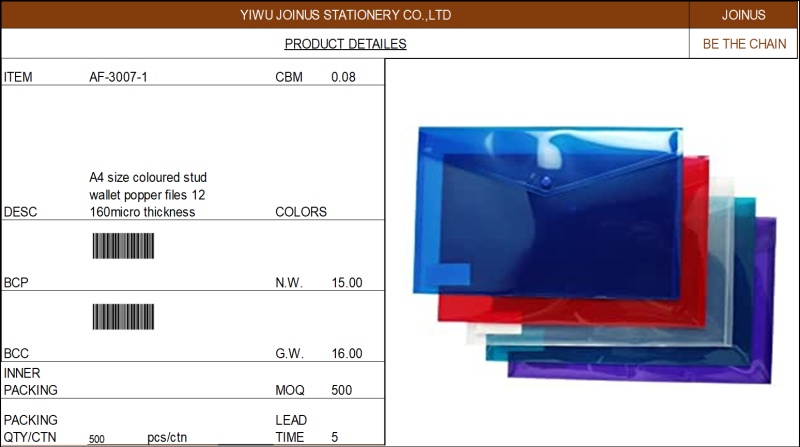 About Product:A4扣袋A4 size coloured stud wallet popper files pack of 5 folders 160micro thickness AF-3007-1
