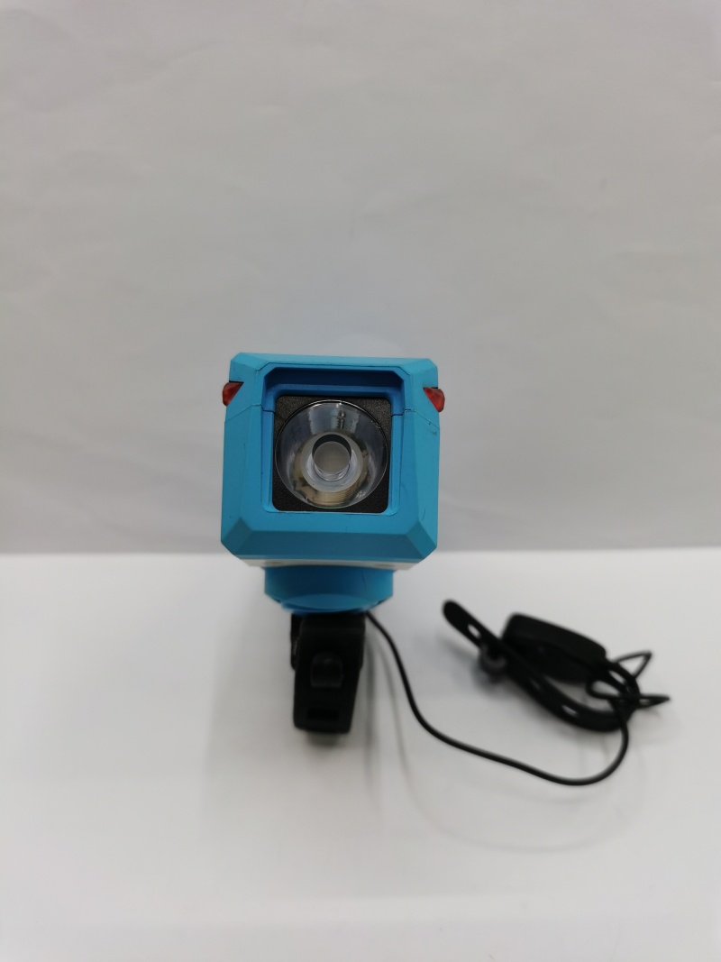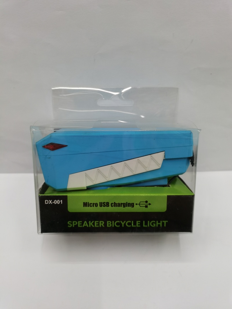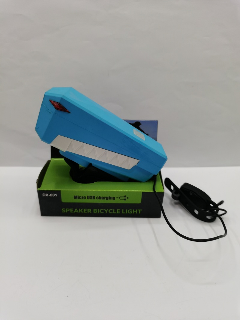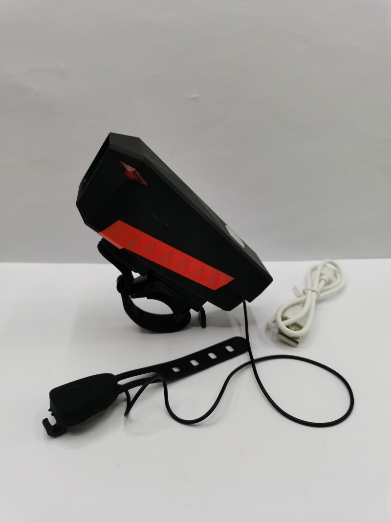 About Product:New charging bicycle lamp horn lamp, ABS material a strong light T6 lamp bead, button switch strong light low light quick flash and slow flash four gear with horn, built-in high capacity charging battery is equipped with a USB charging cable, the color has blue and black can be mixed, a single color box plus transparent plastic case packaging a box of 120PCS