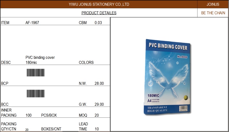 About Product:PVC装订胶片A4装订封面透明胶片纸塑料片 PVC binding cover 180mic AF-1967