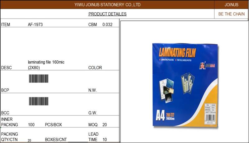 About Product:塑封膜过塑膜护卡膜过胶膜laminating file 160mic (2X80) AF-1973