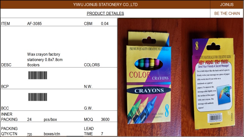 About Product:8色蜡笔 Wax crayon factory stationery 0.8x7.8cm 8colors AF-3085