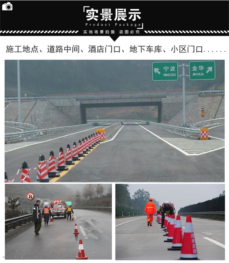 5.Usage:Used for placing in the middle of the road, dangerous areas and road construction sites, etc., set in need to temporarily separate traffic flow, guide traffic, guide vehicles around dangerous sections, protect construction sites facilities and personnel and other places around or other appropriate locations. Usually used in urban intersection lanes, expressway maintenance, traffic police law enforcement, road administration law enforcement, hotels, residential areas, sports venues, dangerous areas, road construction sites, etc.