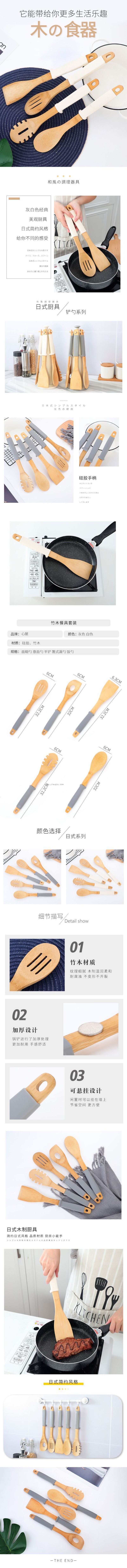 silicone bamboo kitchenware 5 piece suit, non-stick silicone kitchenware set