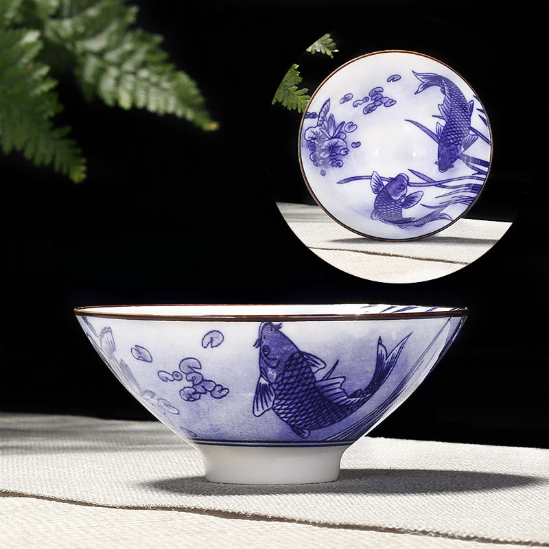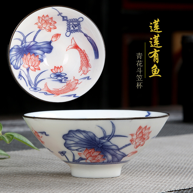 single teacup-white jade-multicolor, large-lotus with fish