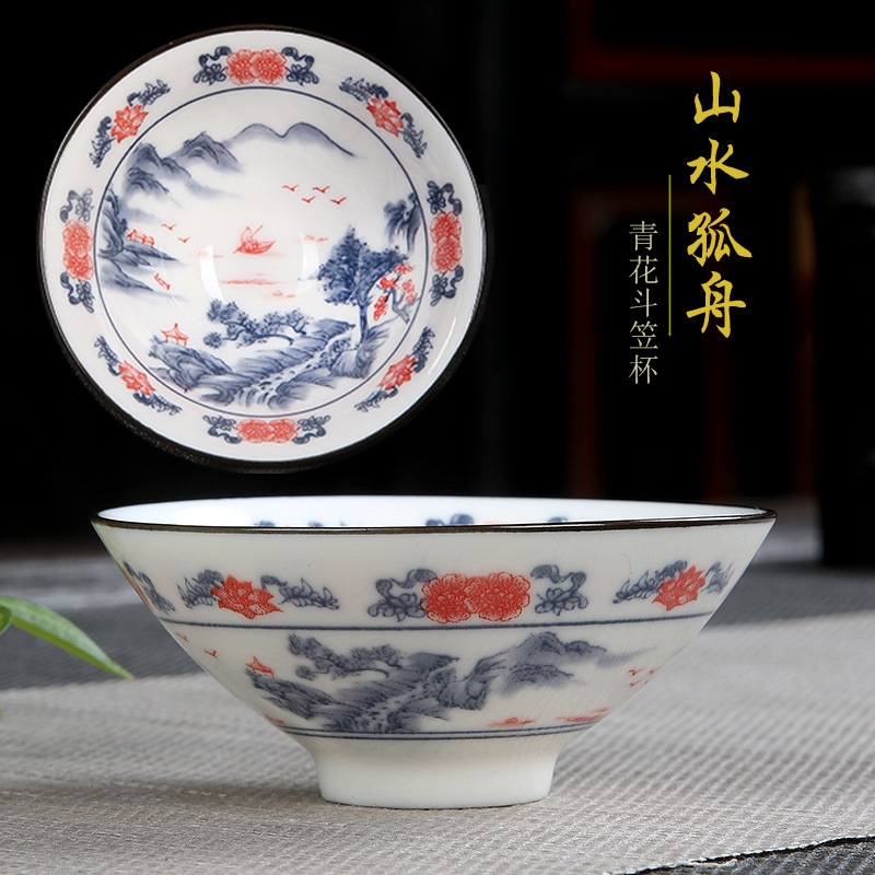 single teacup-white jade-multicolor, large-landscape boat