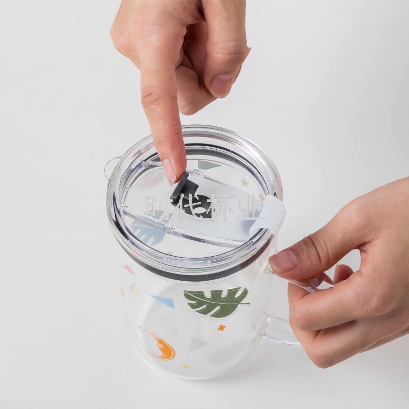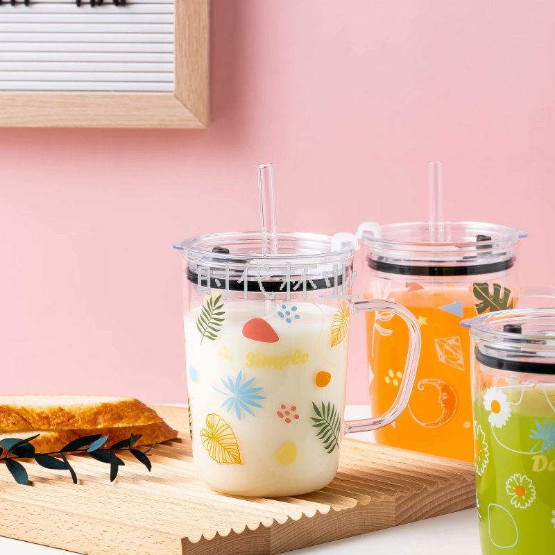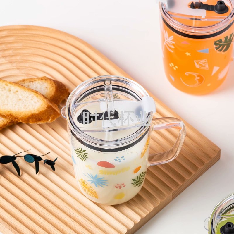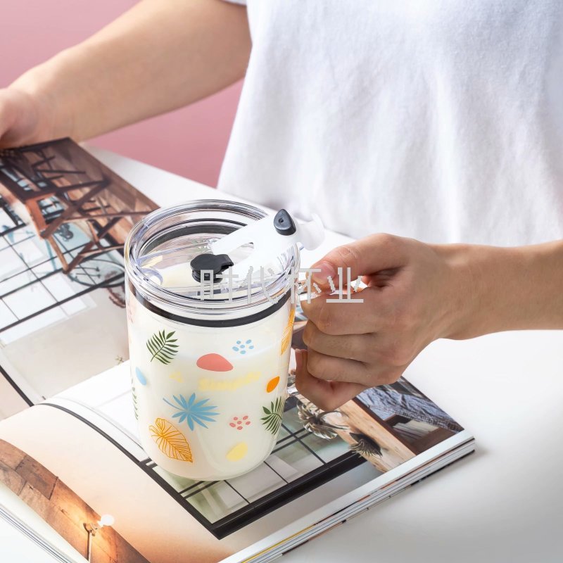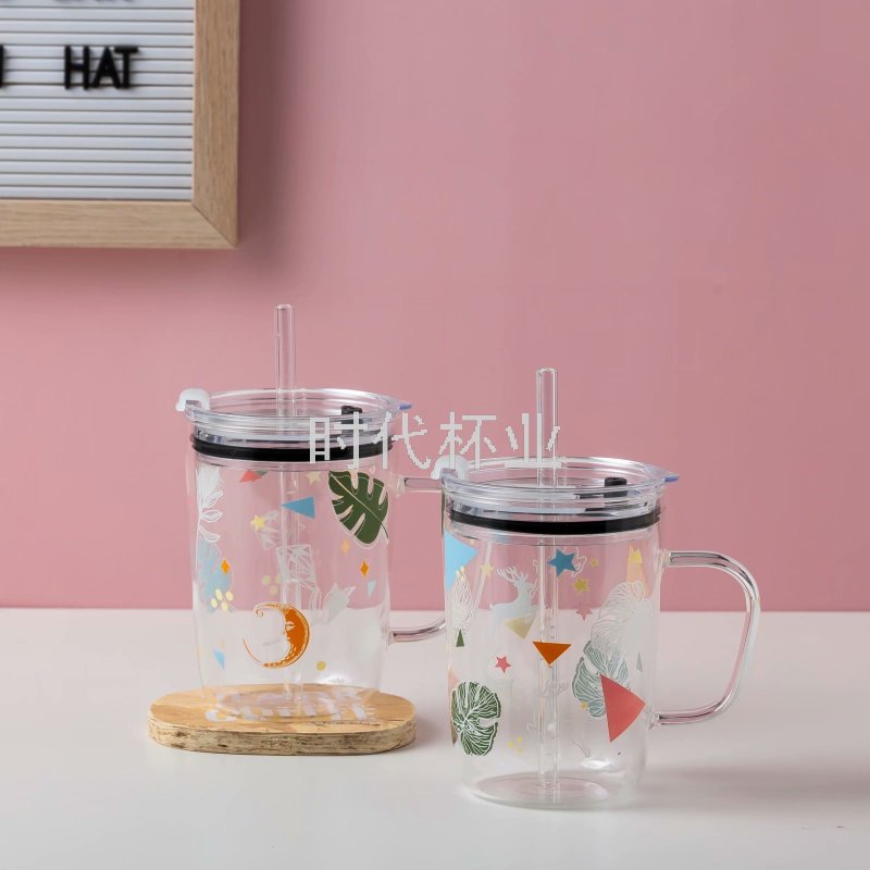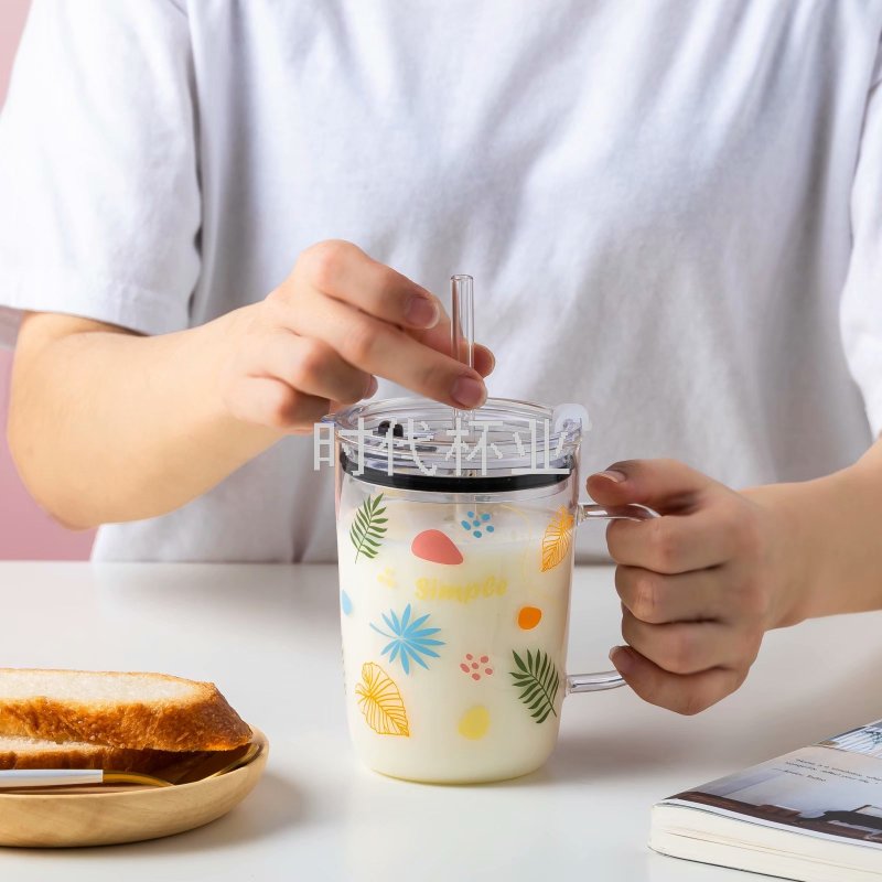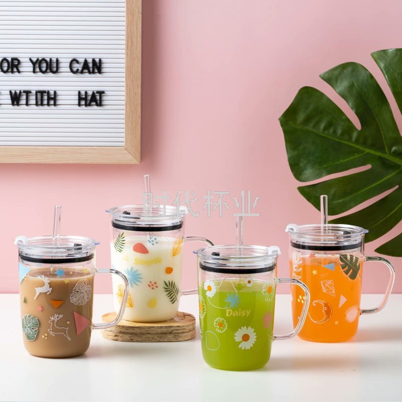 Factory Direct Sales Popular Hand Color Green Plant Glass Straw Cup Handle High Temperature Resistant Milk Tea Cup Juice Cup