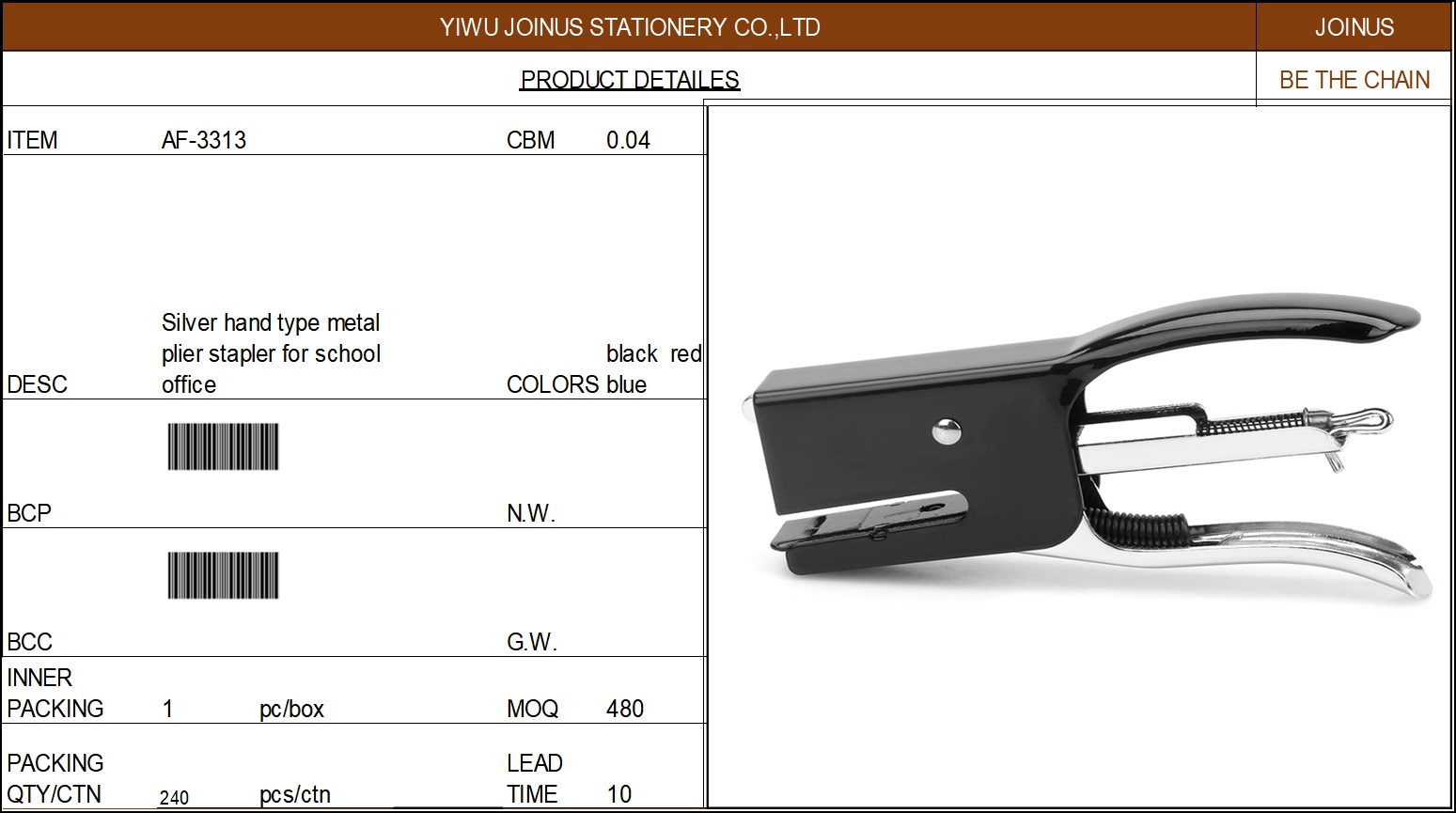 hand type metal plier stapler 12pages 10# staple size11.2x1.8x5.8 for school office AF-3313