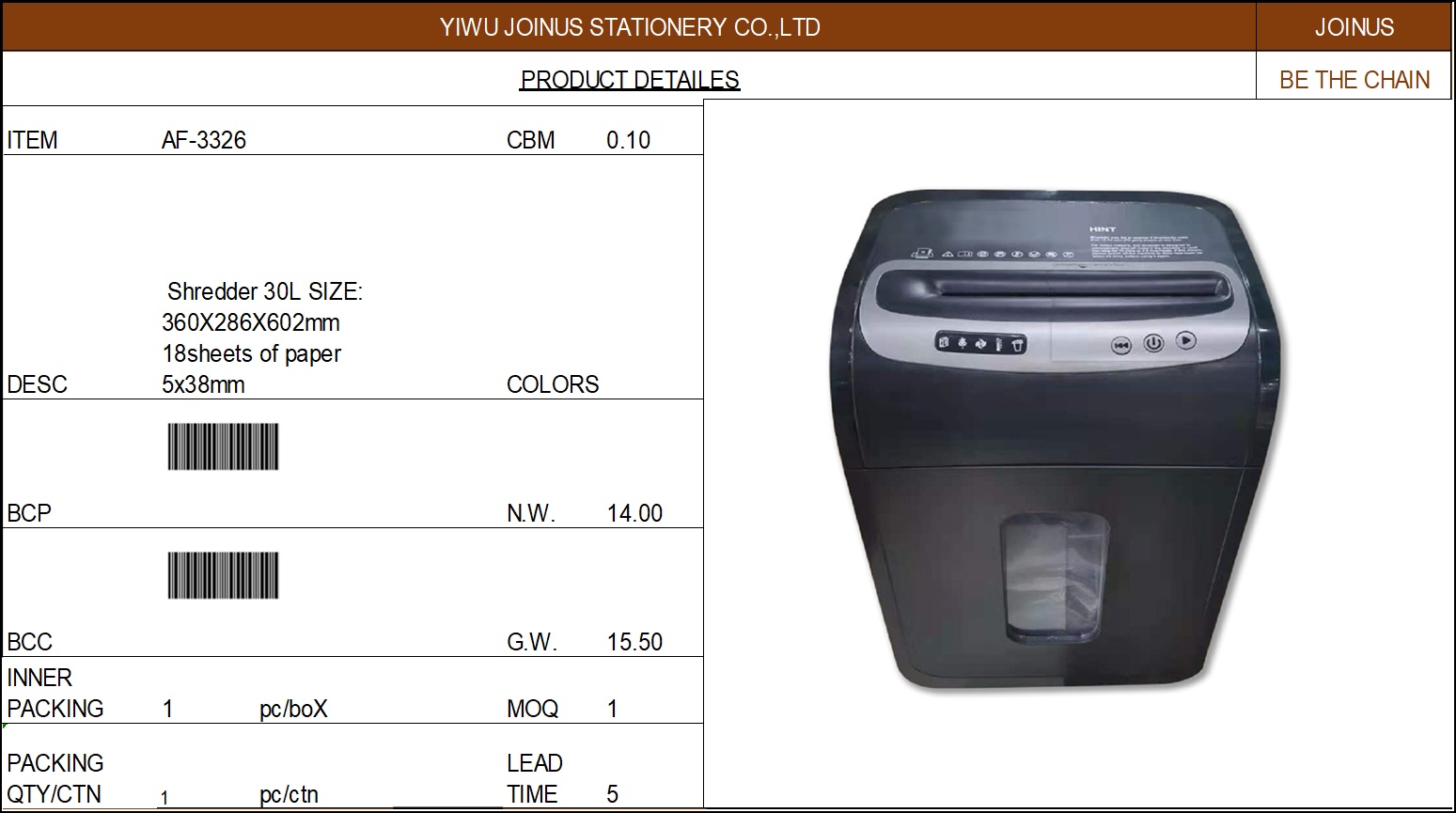 About Product:碎纸机 Shredder 30L SIZE: 360X286X602mm 18sheets of paper 5x38mm AF-3326