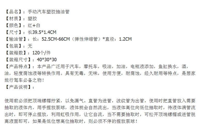 About Product:Car pumping oil pipe gasoline manual self-priming hose portable fuel tank oil extractor motorcycle pumping water device car household