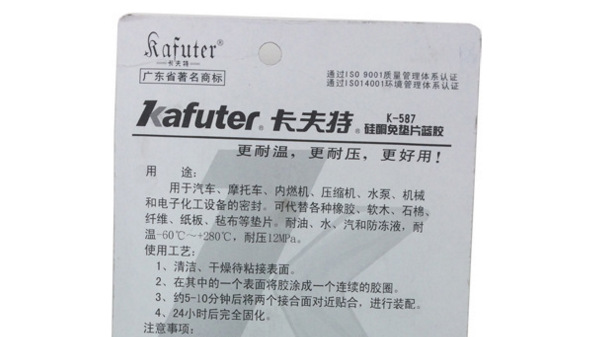 K-587 Blue Adhesive without gaskets is a single-component room-temperature curing sealant synthesized with silicone rubber as the main raw material. It cures quickly at room temperature; it has good thixotropy, does not flow, does not corrode or pollute components; it has excellent air, water, and oil sealing properties; it has excellent electrical insulation performance and aging resistance; it has good temperature resistance; it is flexible, has high elongation, and can replace all gaskets.
