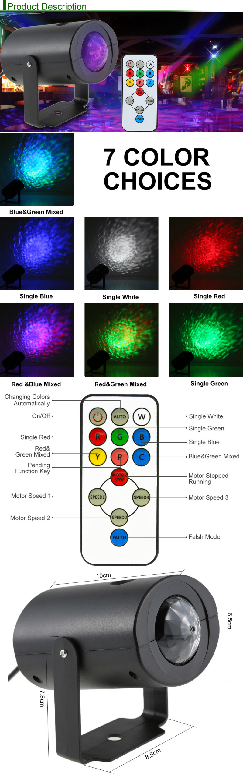 Remote control LED water pattern light with 7 colors and dynamic water wave pattern effects.