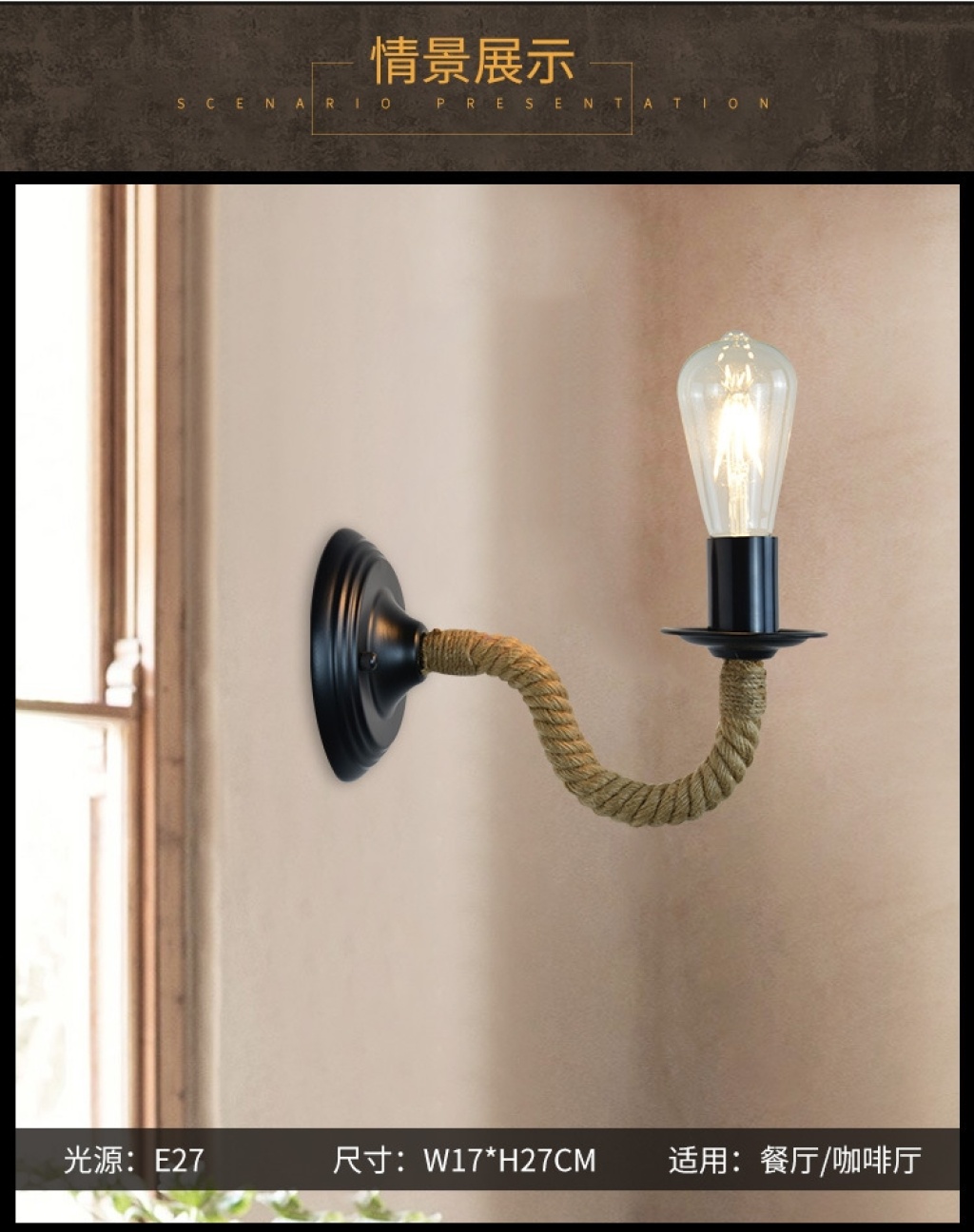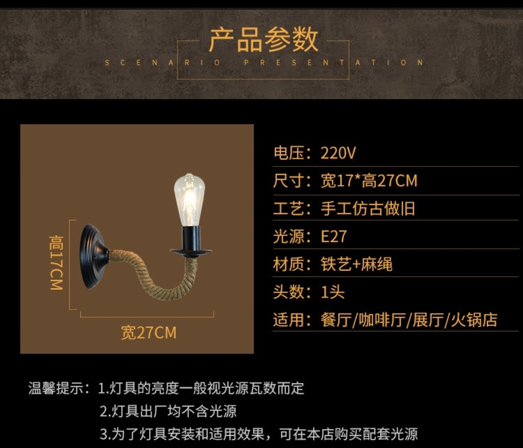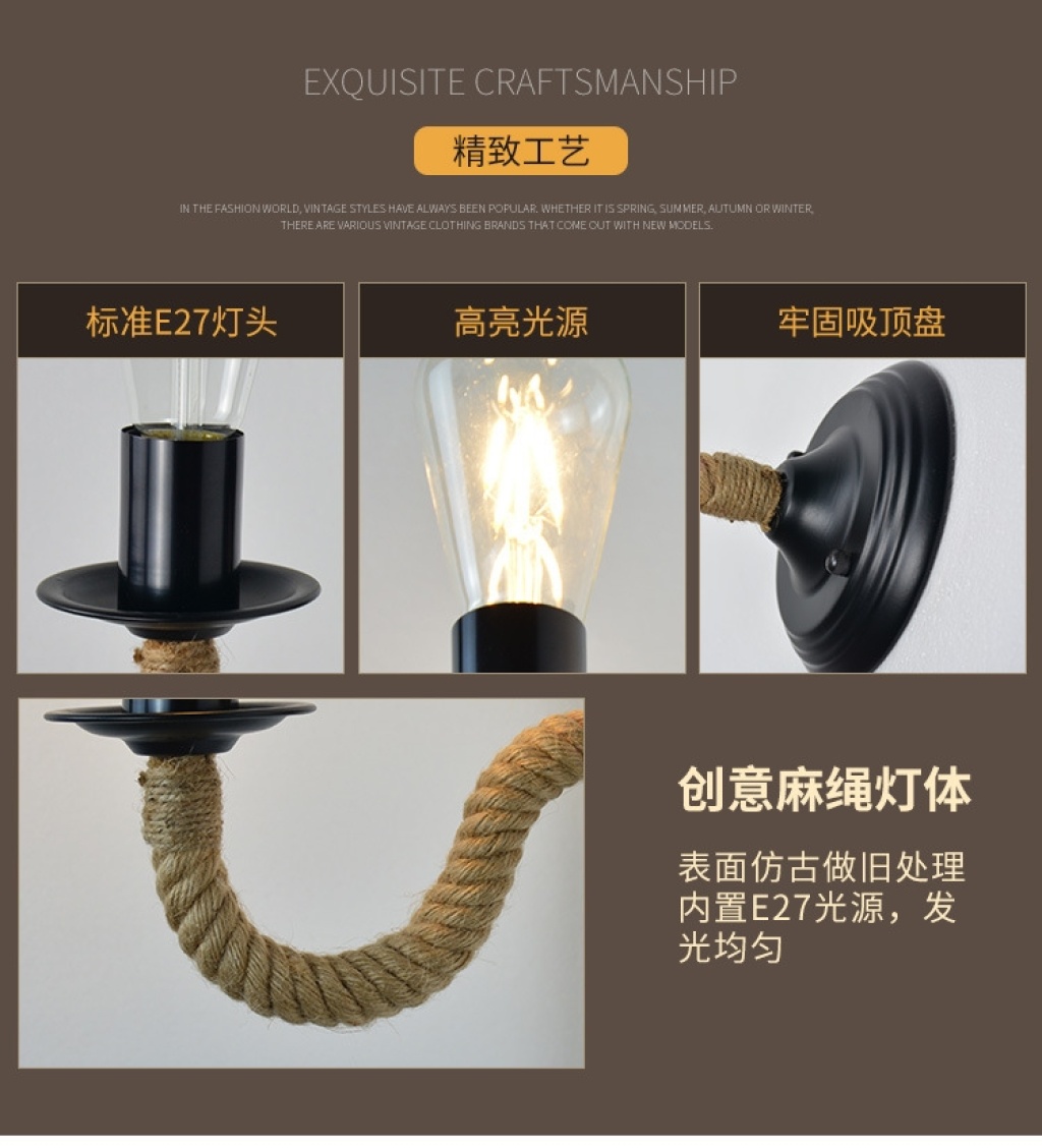 exclusive for cross-border american country industrial style bar cafe hemp rope wrought iron aisle bedside lamp wall lamp wholesale