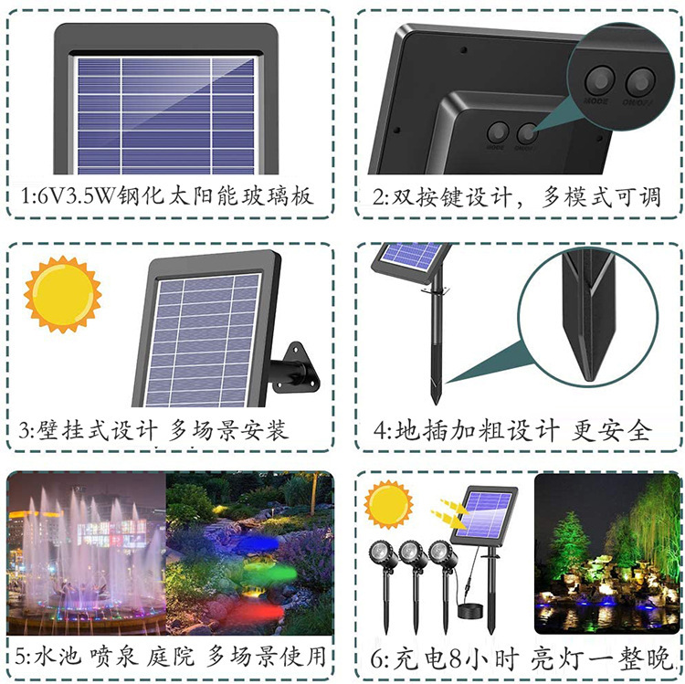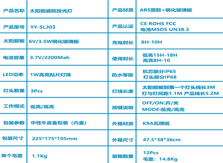 3)太阳能板固定在户外的时候,必须正面朝上,这样可以有效防雨淋。灯头部分无防水设计,请避免与水接触。