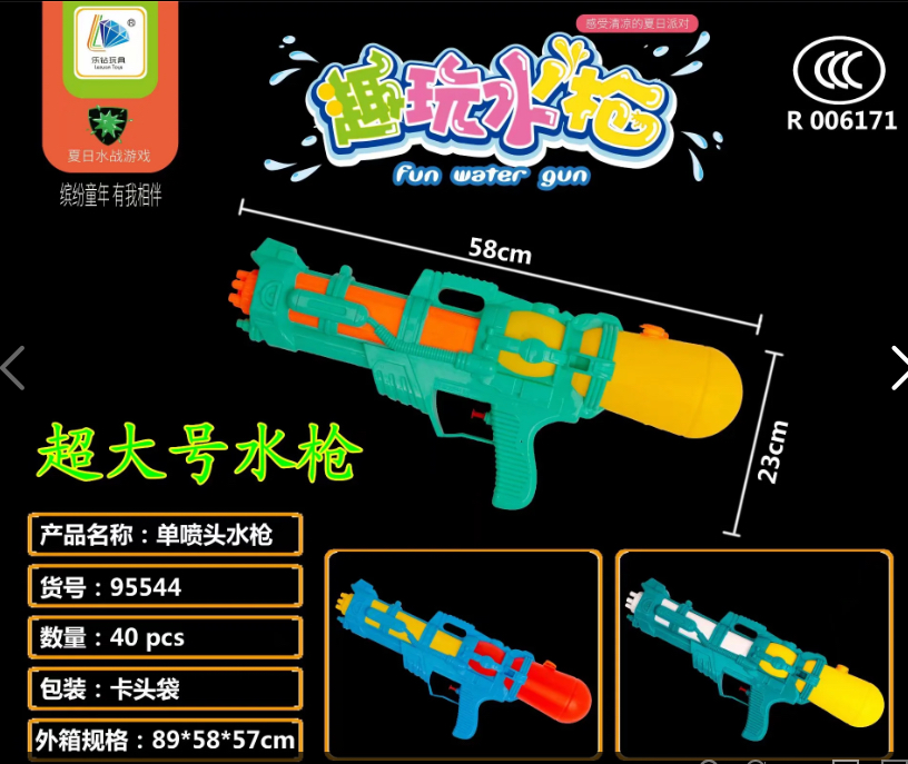 Super-sized single nozzle water gun, product size 58×23, card head bag packaging, with Chinese packaging belt and 3C certificate, a case of 40 pieces, mixed packaging of two colors, outer box size 89×58×57