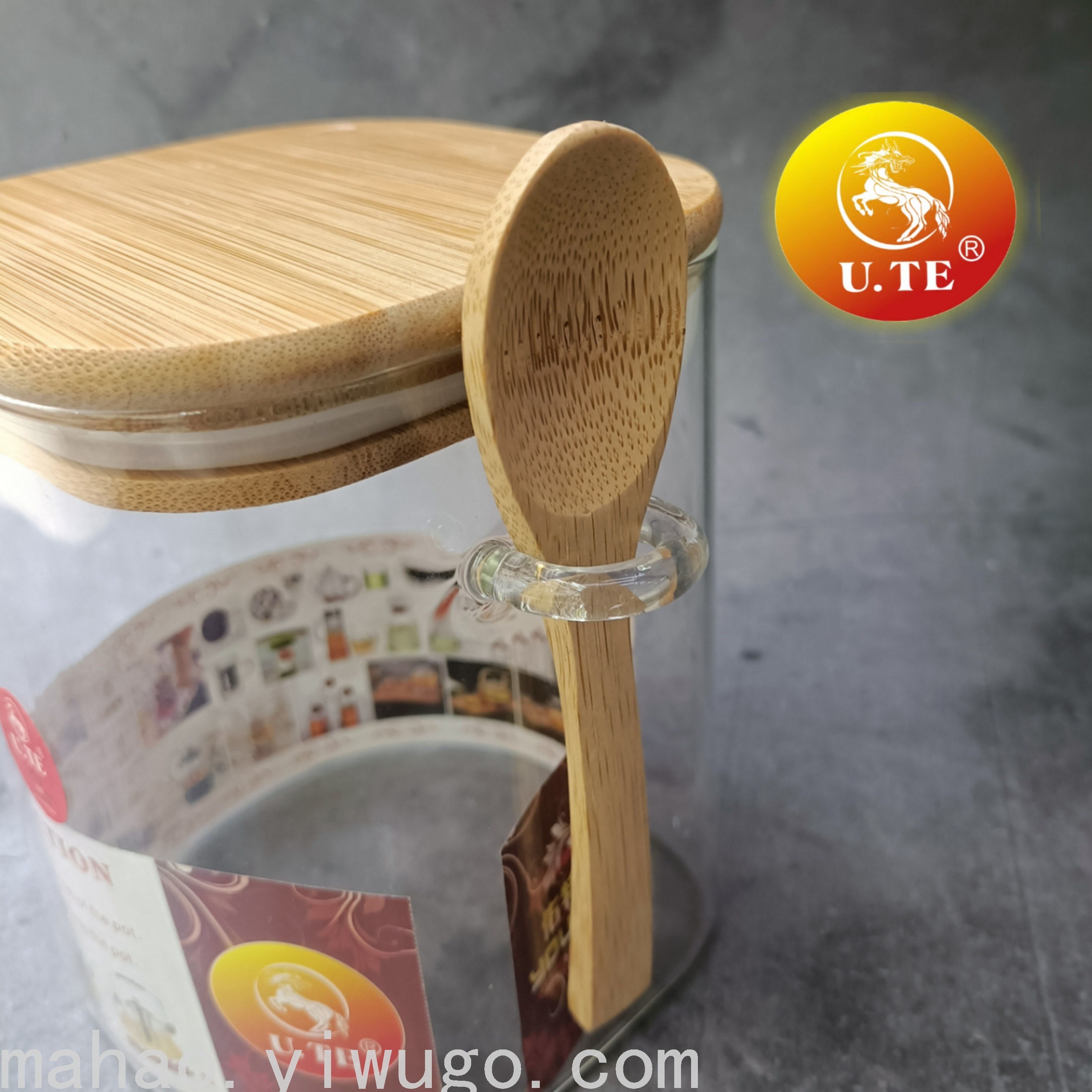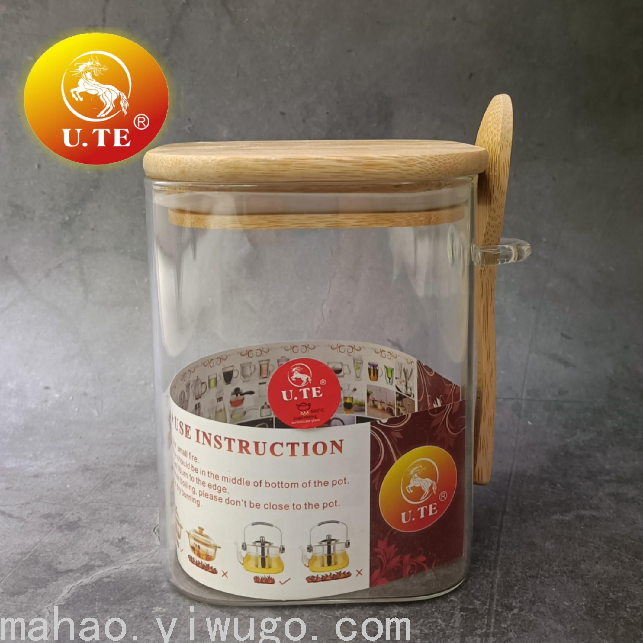 Square Bamboo Cover Glass Sealed Can with Spoon