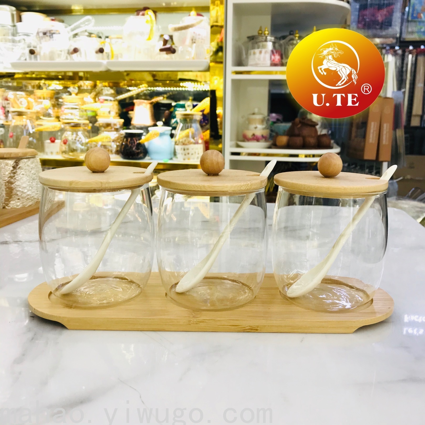Bamboo Cover Glass Seasoning Jar Three-Piece Set