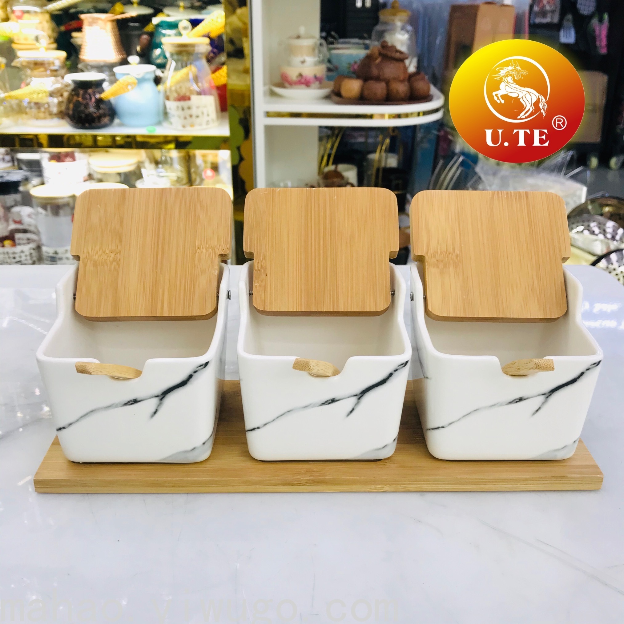 Bamboo Cover Marbling Seasoning Jar Three-Piece Set