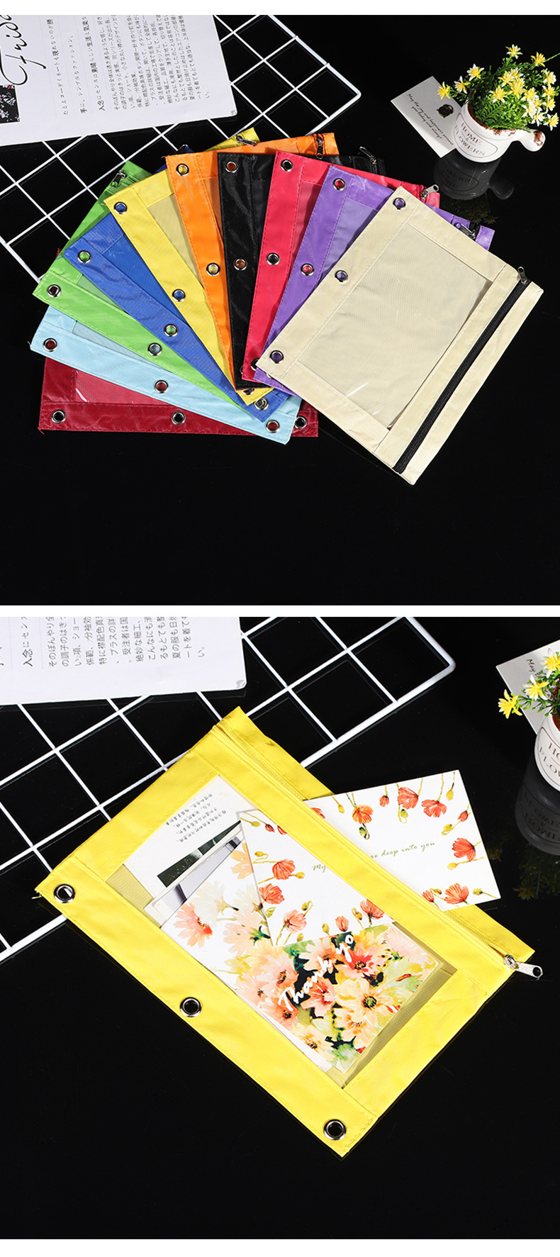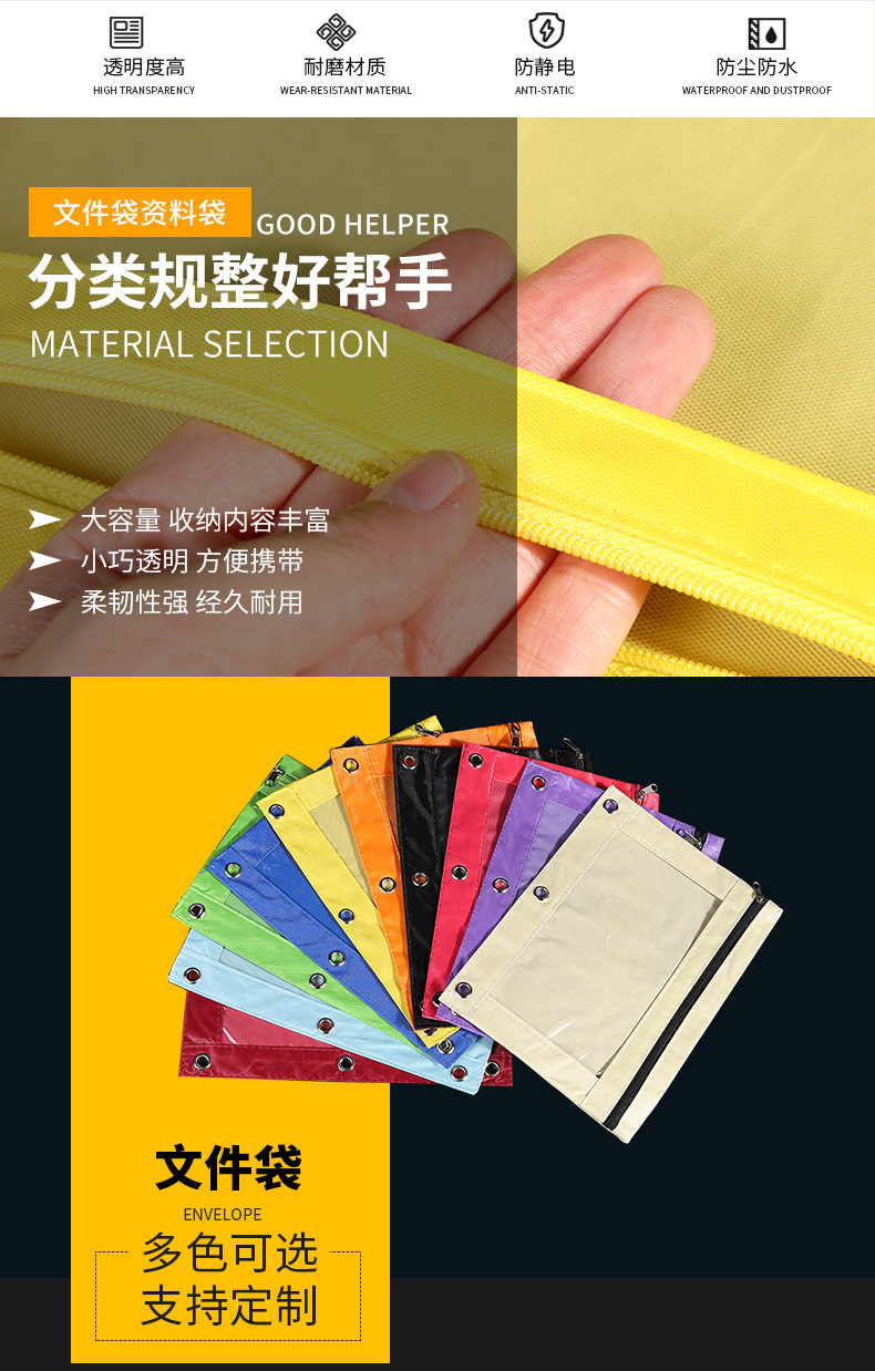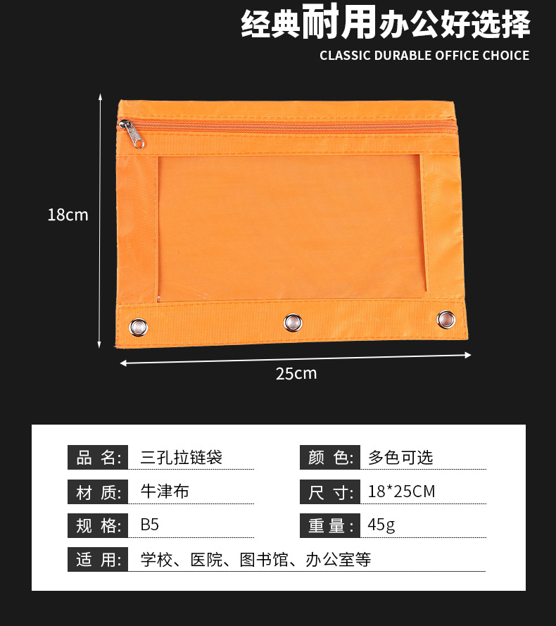 Factory Direct Sales Durable Oxford Cloth Three-Hole Zipper Bag Learning Office Waterproof Transparent Thickened Corner Folder