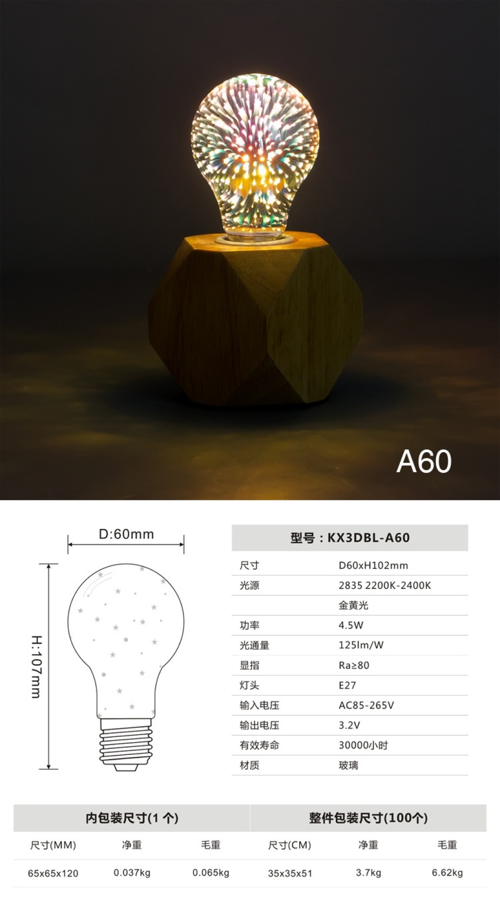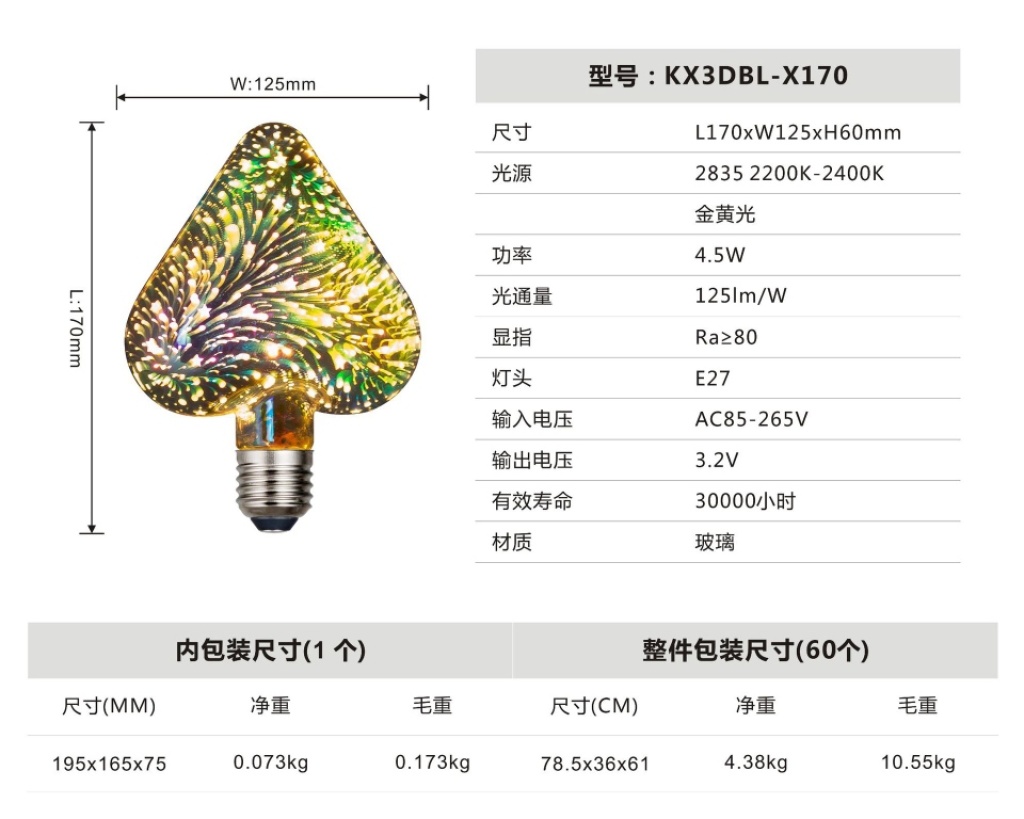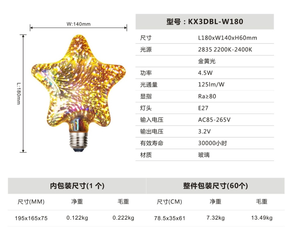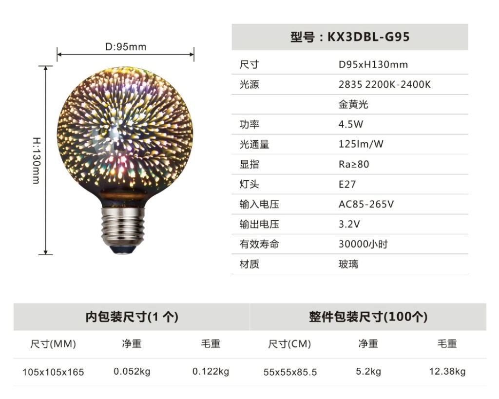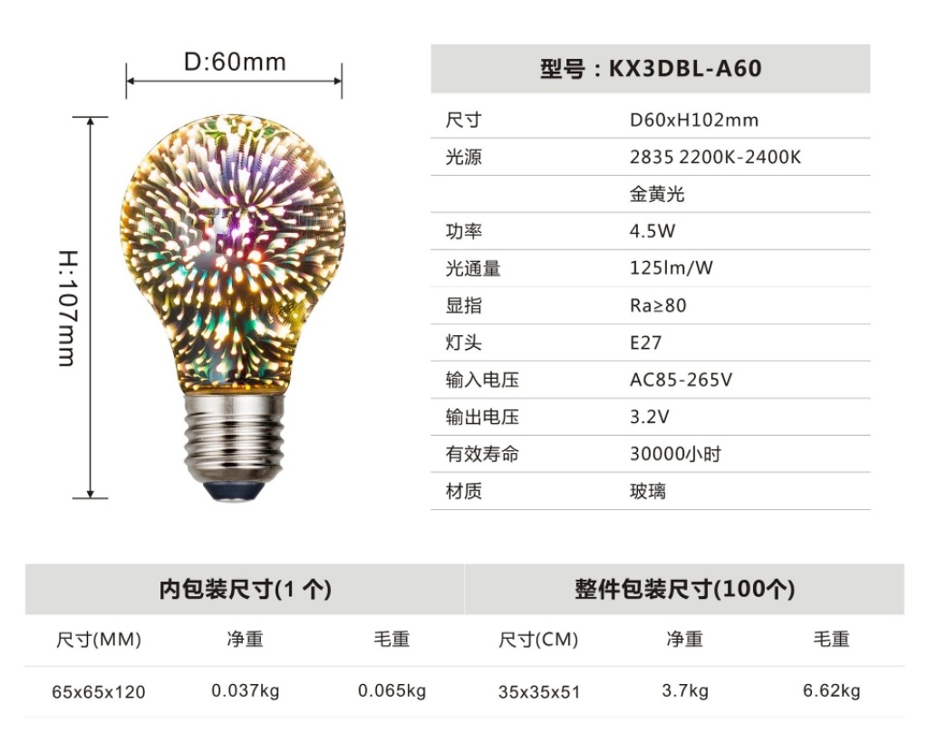 led3d fireworks e27 bulb a60g80 95 125 st64 five-pointed star christmas tree and other styles