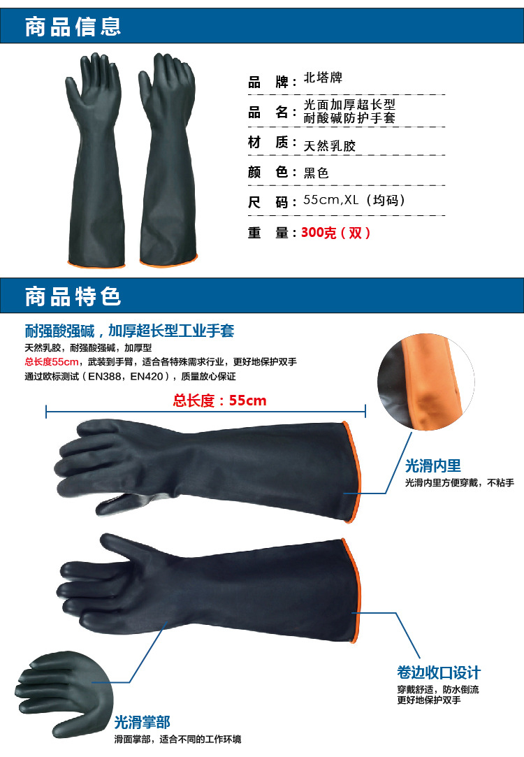 2. This product can use appropriate amount of acid and alkali resistant materials, and can operate continuously in sulfuric acid solution with a concentration of less than 45% and sodium hydroxide solution with a concentration of less than 30%, which has better acid and alkali resistance than ordinary gloves of the same kind.