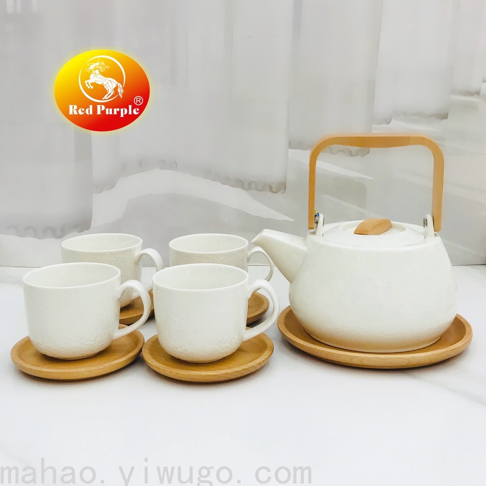 Ceramic Pot with Four Cups +5 Wooden Tray