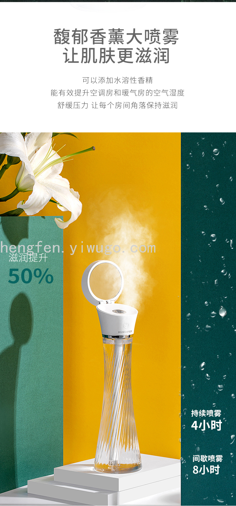 About Product:Material: ABS + Pet + Silicone + Electronic Yuan PackageBox Size: 80Product Size: 70*38 * 246mmProduct Packaging: 72*72*221mmCarton Size: 58.5*37 * 46.5cmSingle Net Weight/Gross Weight; 178G/250GNet Weight/Gross Weight: 20kg/21kgColor: Xiang Fei Pink, Deep Sea Blue, Coral Blue, Ivory WhiteWater Tank Capacity: 250mlSpray Volume: 40Ml/H