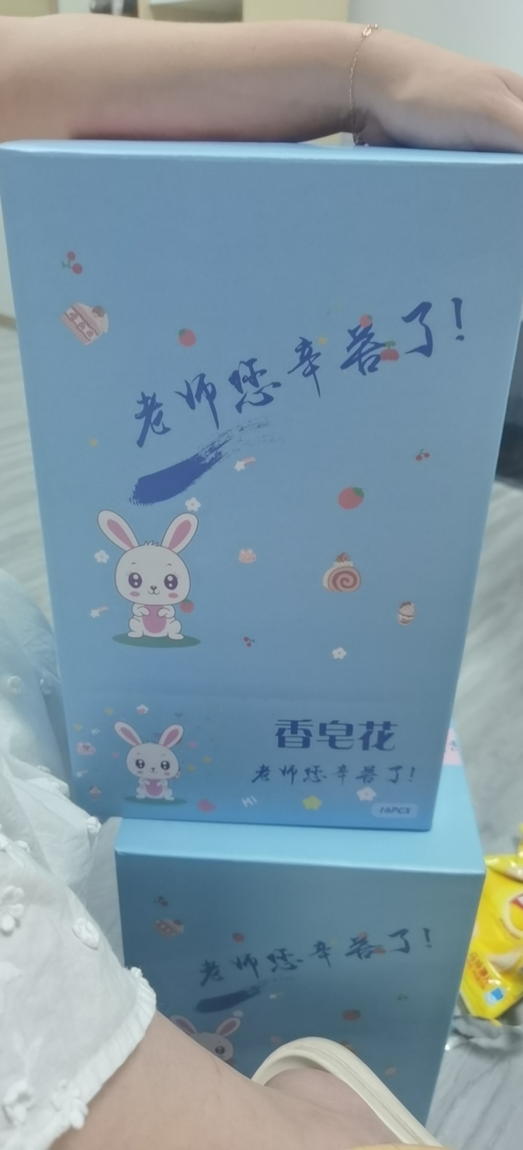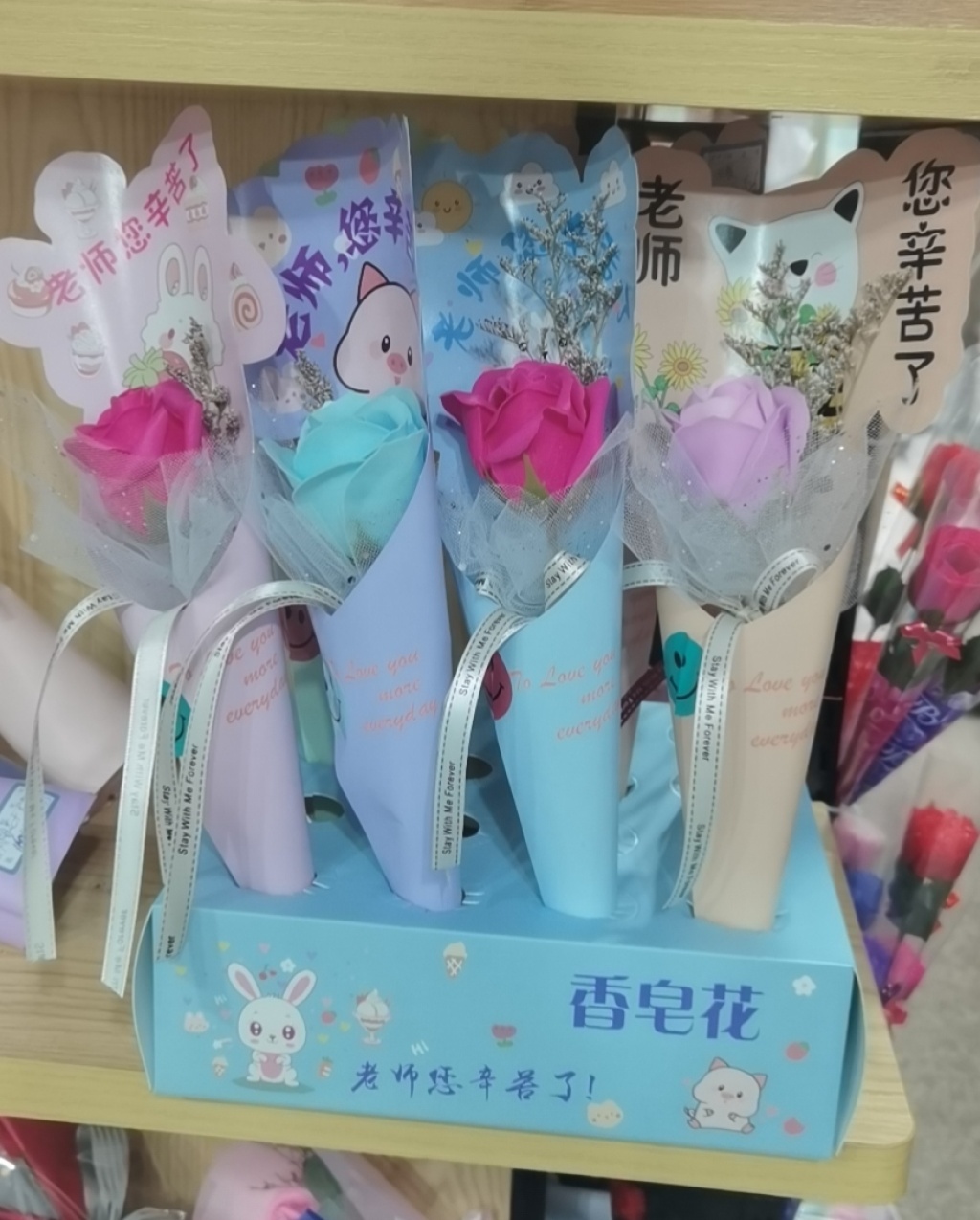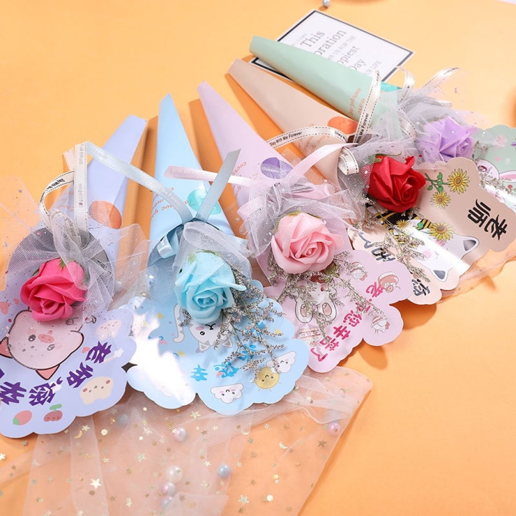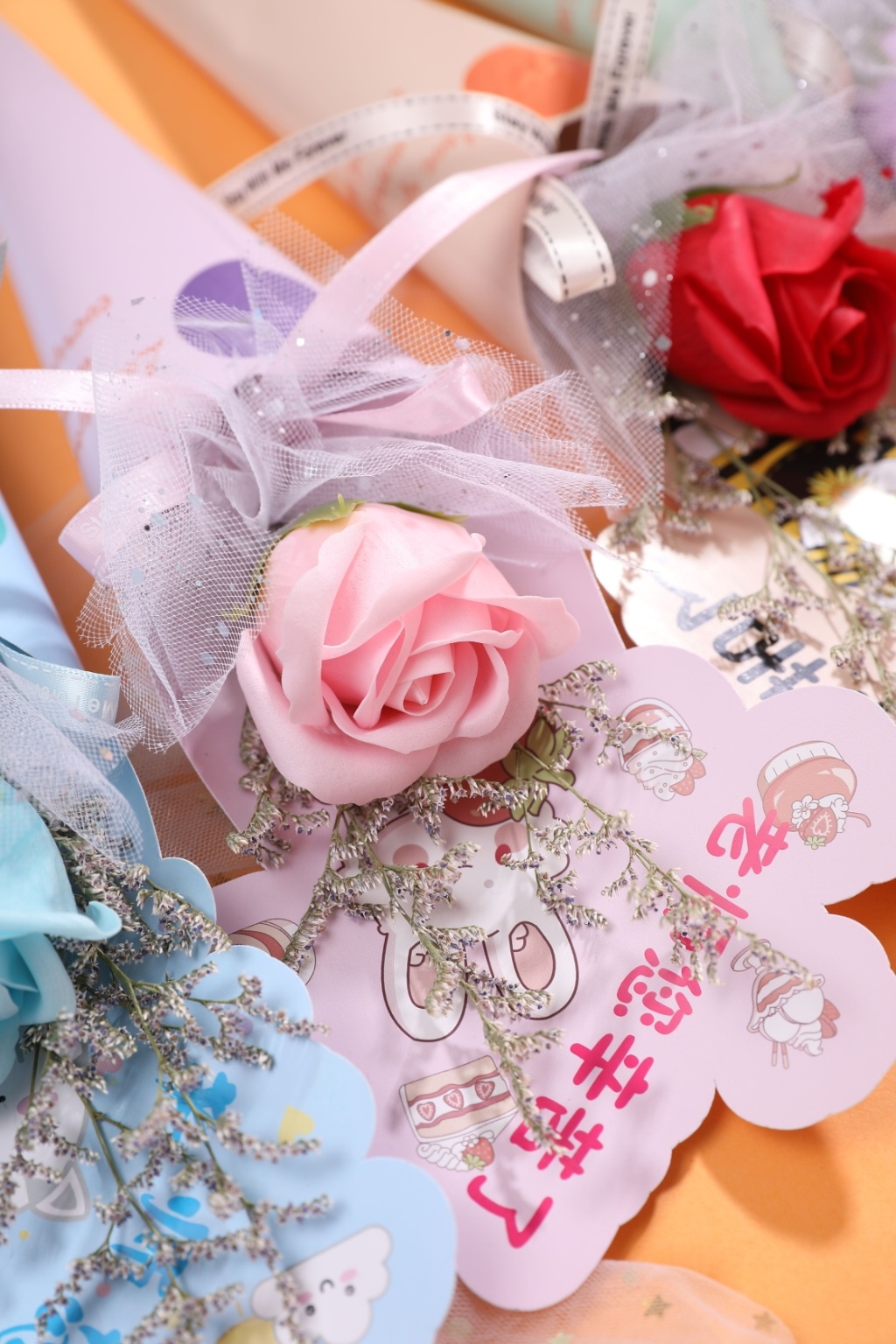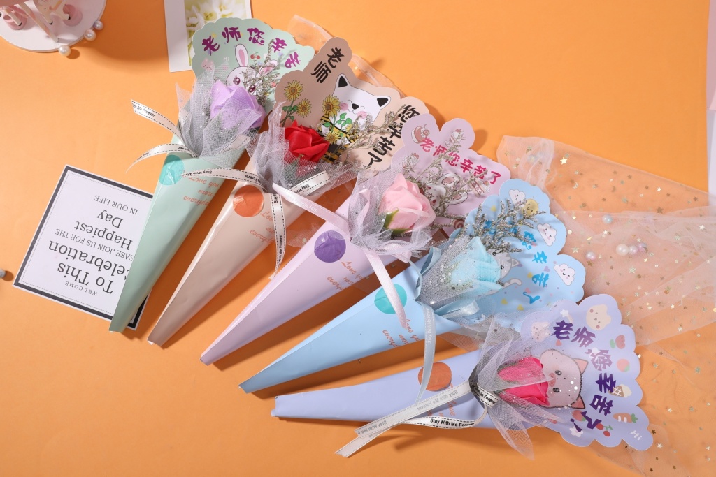 Material: dried flowers, soap flowers, cards, netting, ribbons.