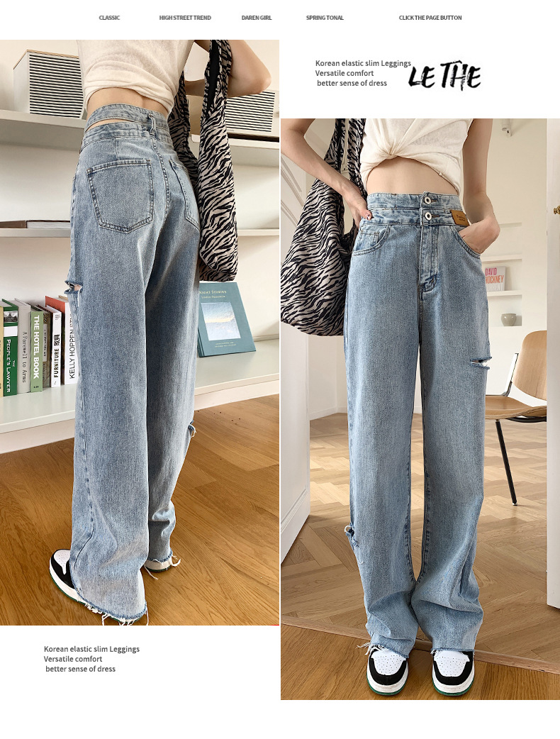 High Waist Jeans Summer 2021 New Women's Ripped Straight Loose Waist Summer Thin Hollow Wide Leg