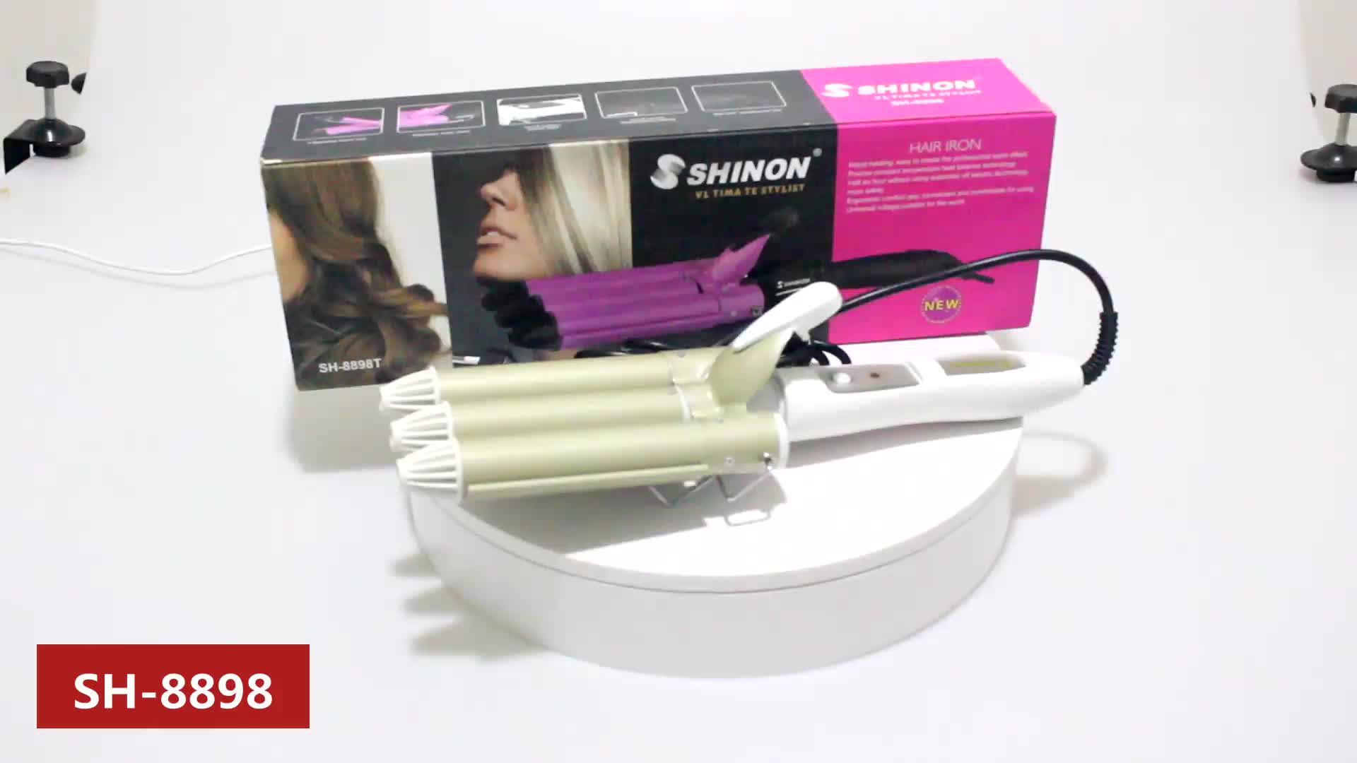 About Product:Product Brand: SHINON product code: SH-8898 product color: Champagne product weight: 490g single with box weight: 712g product packing: 24PCs power voltage: AC 110-240V 50Hz/60Hz 45W optional specifications: European standard, american Standard (to be customized) functional features: 3 tube large wave hair curler egg roll device, wide voltage, ceramic coating, PTC heating element, overheating protection product size: hair curler total length 34cm/heating body length 13cm PTC heating element diameter: 25mm (