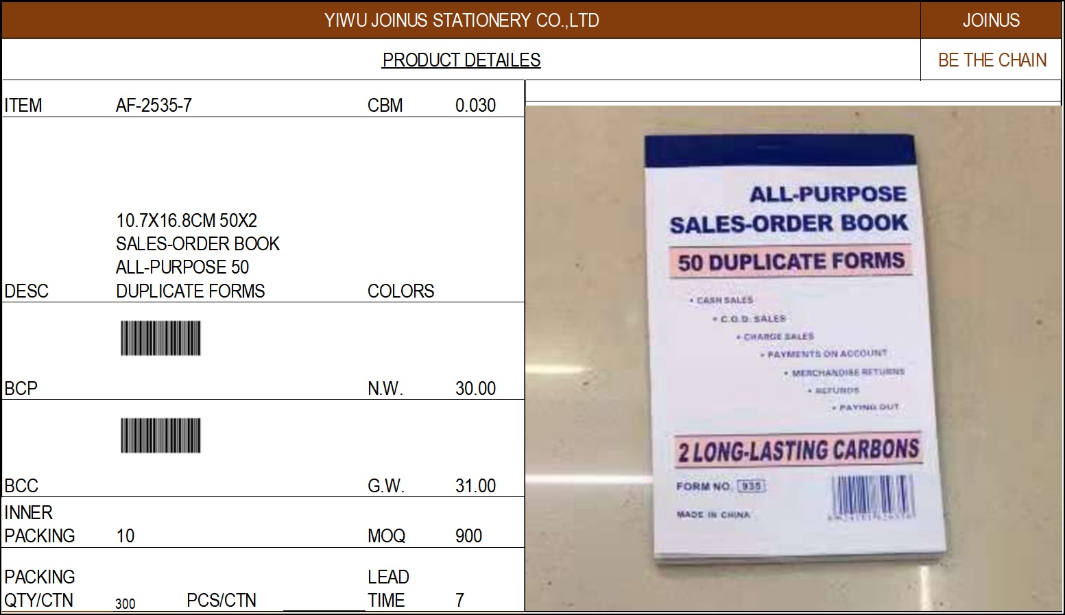 About Product:10.7X16.8CM 英文发票本 50份X2联10.7X16.8CM 50X2 SALES-ORDER BOOK ALL-PURPOSE 50 DUPLICATE FORMSAF-2535-7