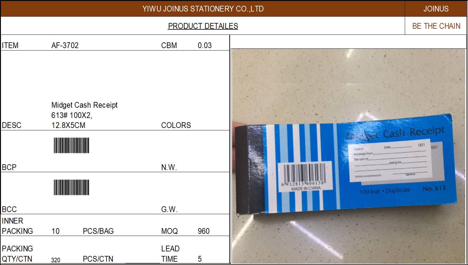 About Product:613# 英文发票本100份X2联 12.8X5CM Midget Cash Receipt 613# 100X2, 12.8X5CM AF-3702