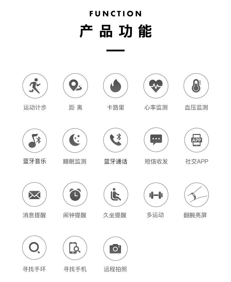bluetooth dialing, phone book, call record, information, exercise record, heart rate, blood pressure monitoring, physical training, remind of long-time sitting, Bluetooth music, sleep monitoring, notification reminder, file management, settings, recording, alarm Clock, stopwatch, remote photo, find mobile phone, calendar, calculator, WeChat, QQ,Twitter,Facebook,WhatsApp
