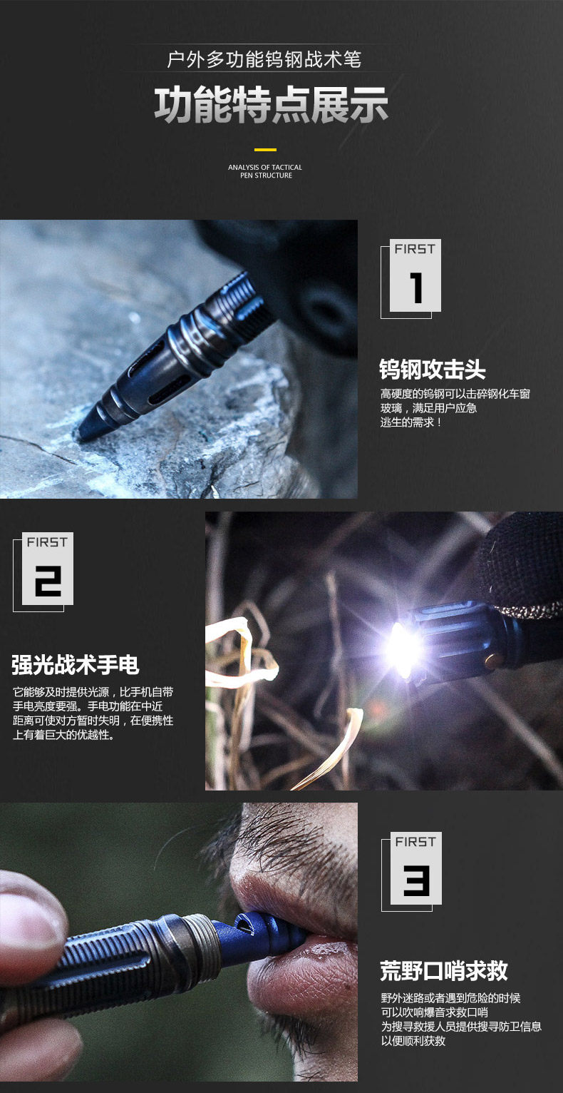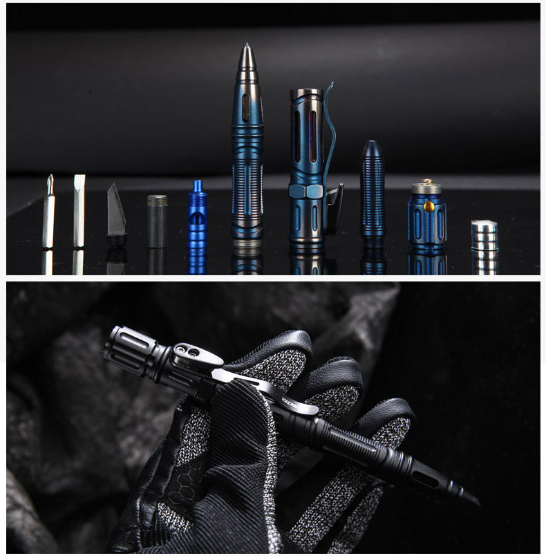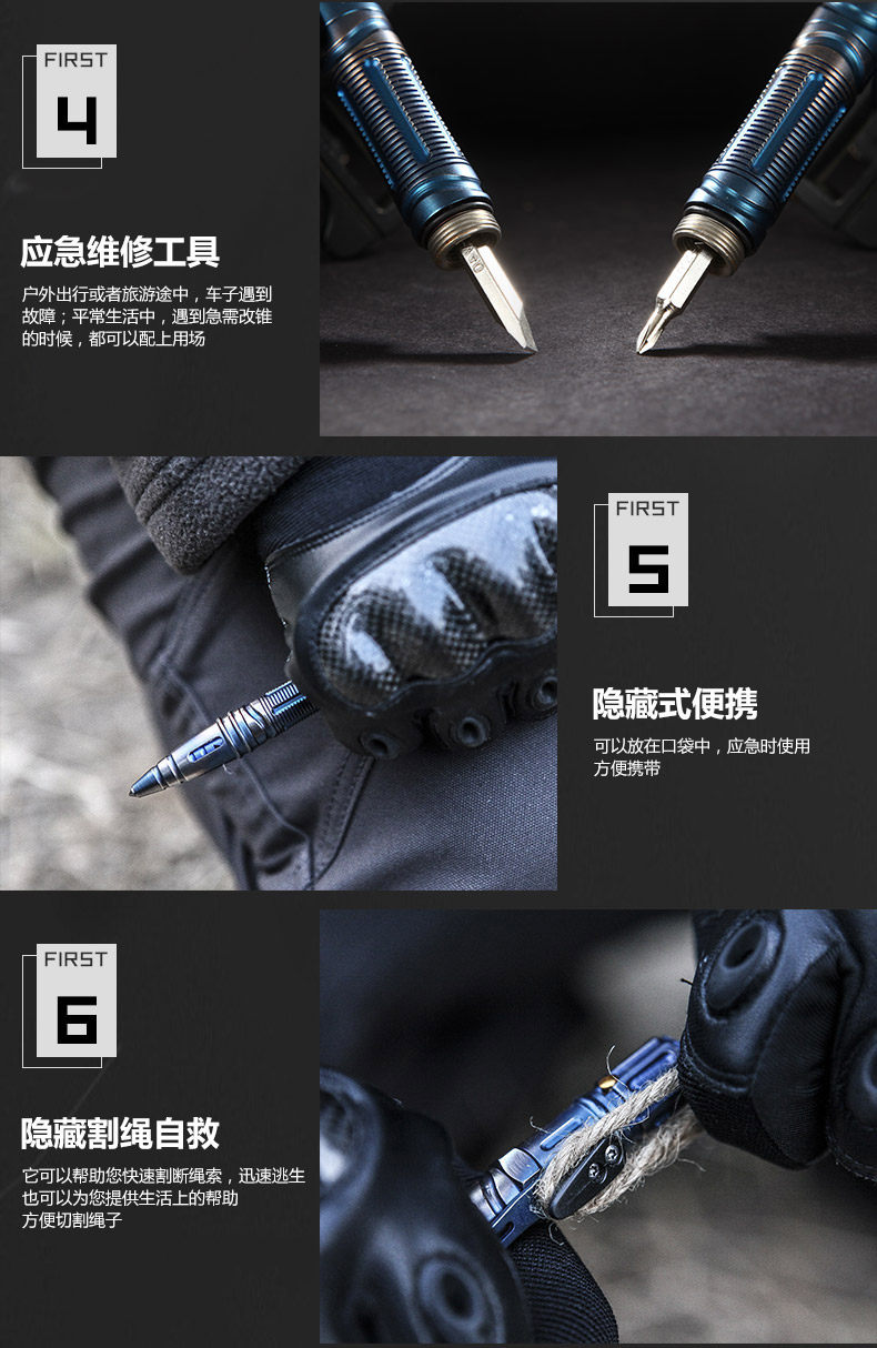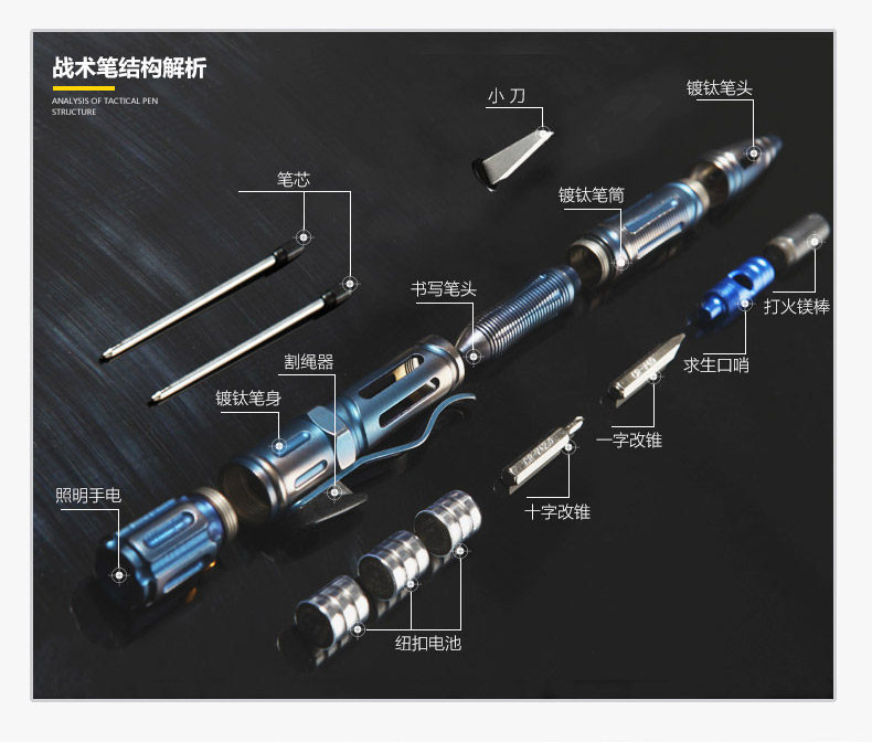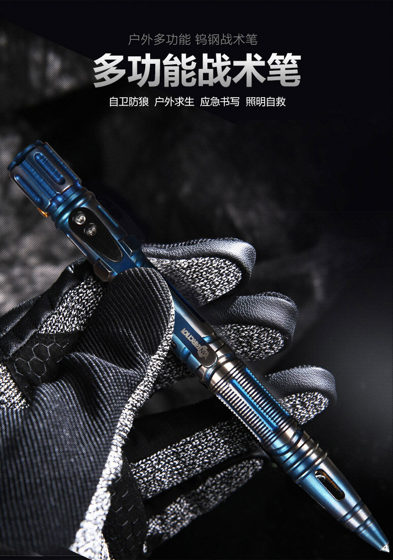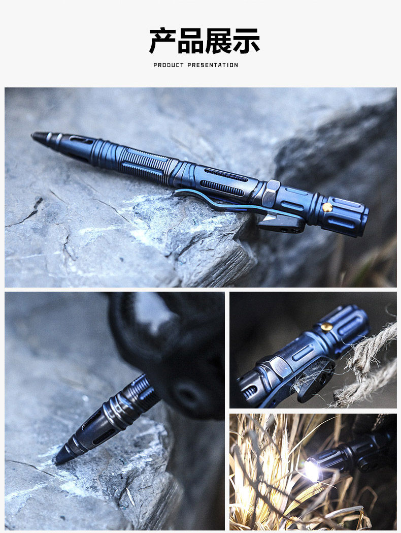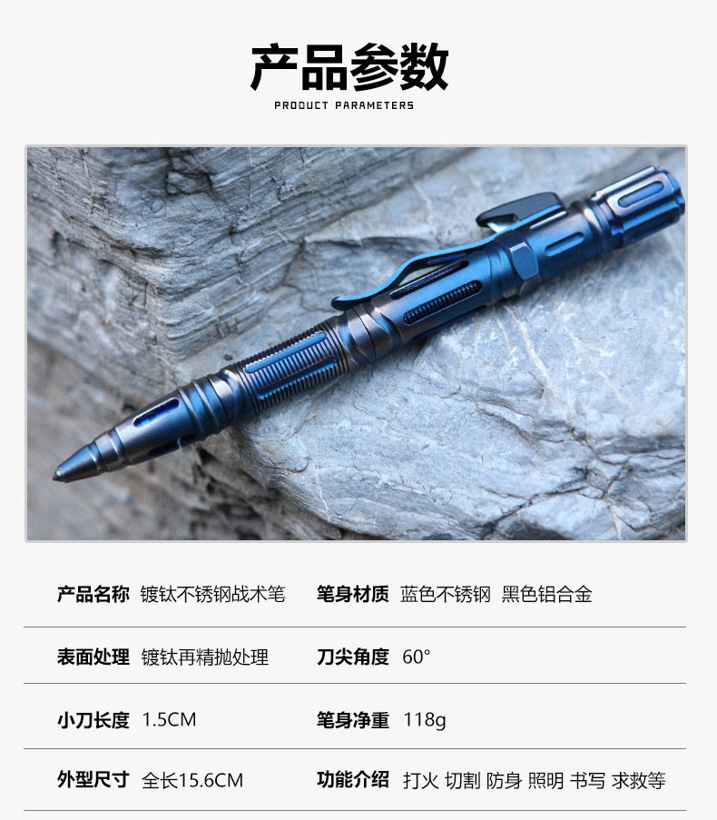 1.产品名称:钛钢不锈钢战术笔 2.笔身材质:蓝色不锈钢 黑色铝合金