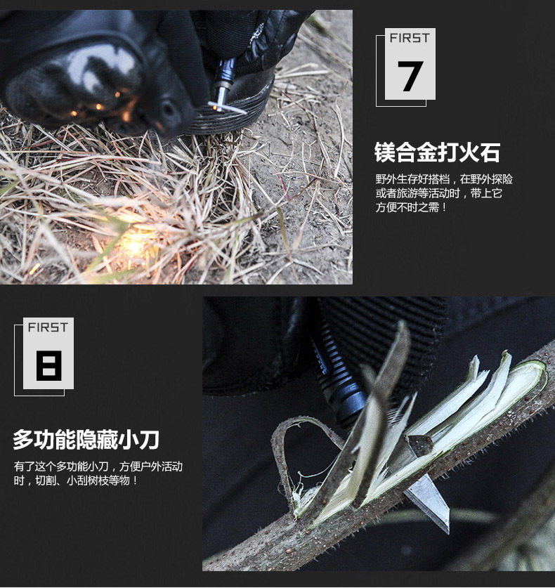 7.外形尺寸:全长15.6㎝ 7.功能介绍:打火 切割 防身 照明 书写 求救