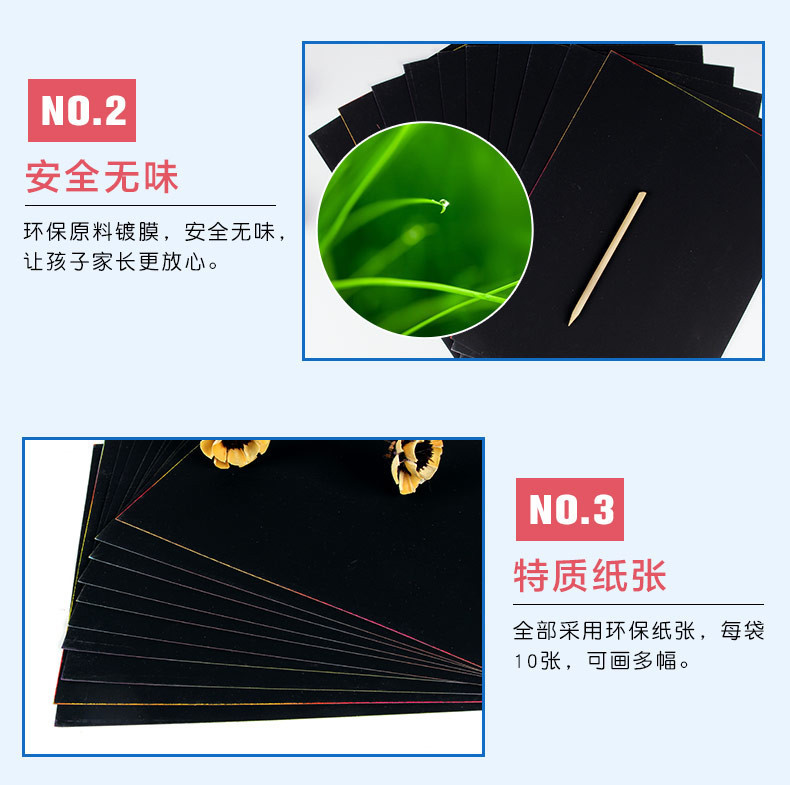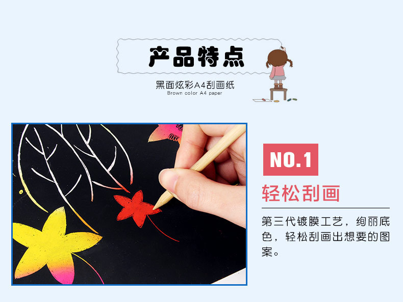 Scrap-board is a novel and unique painting material that combines the characteristics of various painting techniques, making the complex process simple and safe. It has overturned the traditional method of painting with a brush on paper, effectively combining the characteristics of woodblock printing to create a unique effect of scraping with a bamboo brush on the paper. The safety has been greatly improved, making it suitable for students of all ages. Teachers can use it confidently, and students can also freely imagine, which greatly enhances the teaching atmosphere and improves the teaching results.