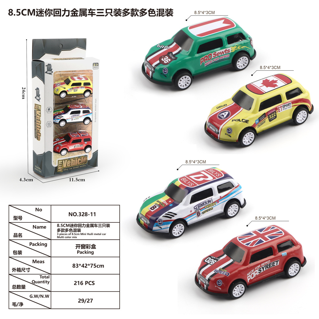 cartoon alloy pull back car mini master 8.5m metal car three loaded multi-color mixed car