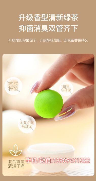 Long-lasting deodorization and odor removal, deodorant Agent. The mixed technology of spices is not mildew or mildew in high temperature and smelly environment. Solid without residue, natural and fresh physical odor removal, effectively eliminate odor, inhibit odor from the root. Upgraded fragrant fresh green tea antibacterial deodorant. Mixed flavor is light and clean.
