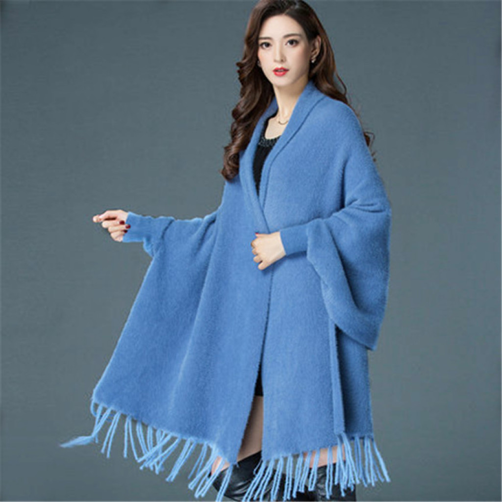 autumn and winter new faux mink cloak tassel shawl scarf dual-use loose solid color batwing sleeve knitted coat female thick