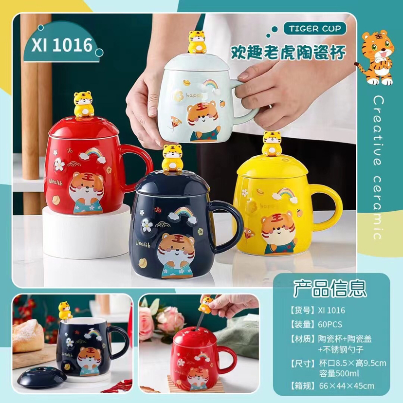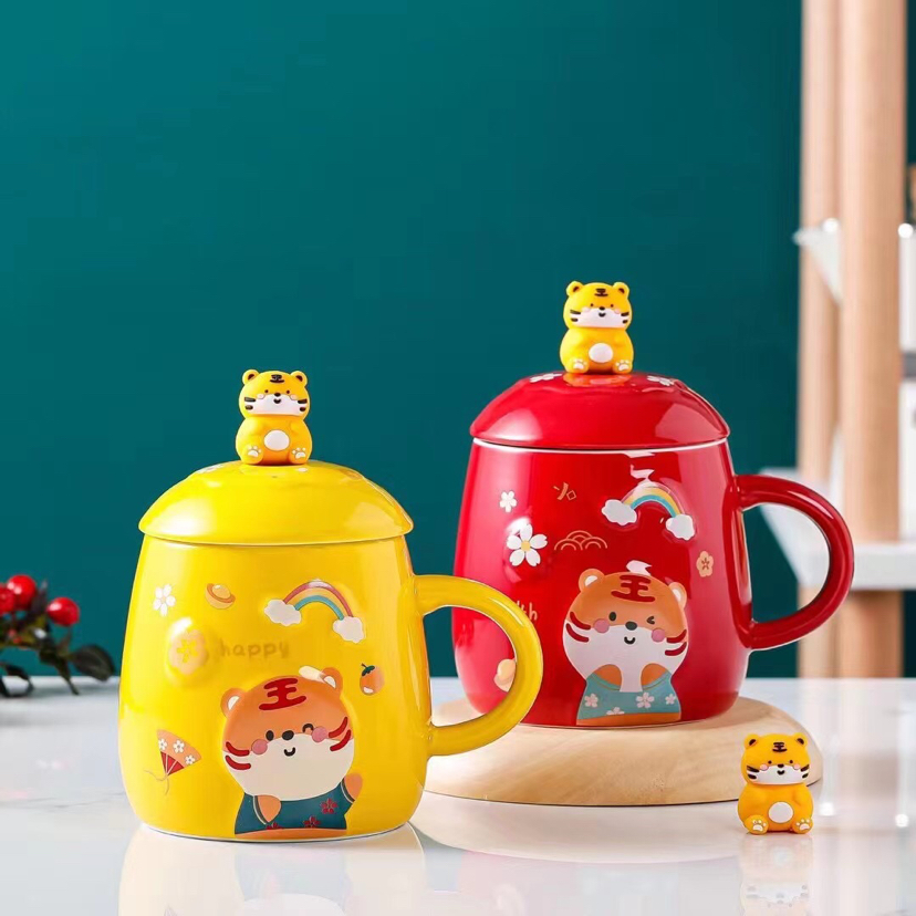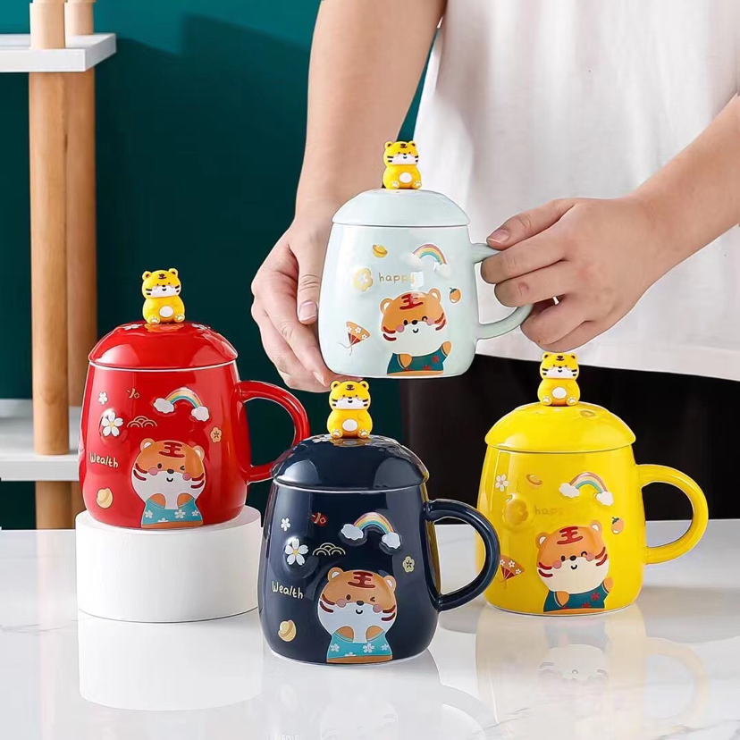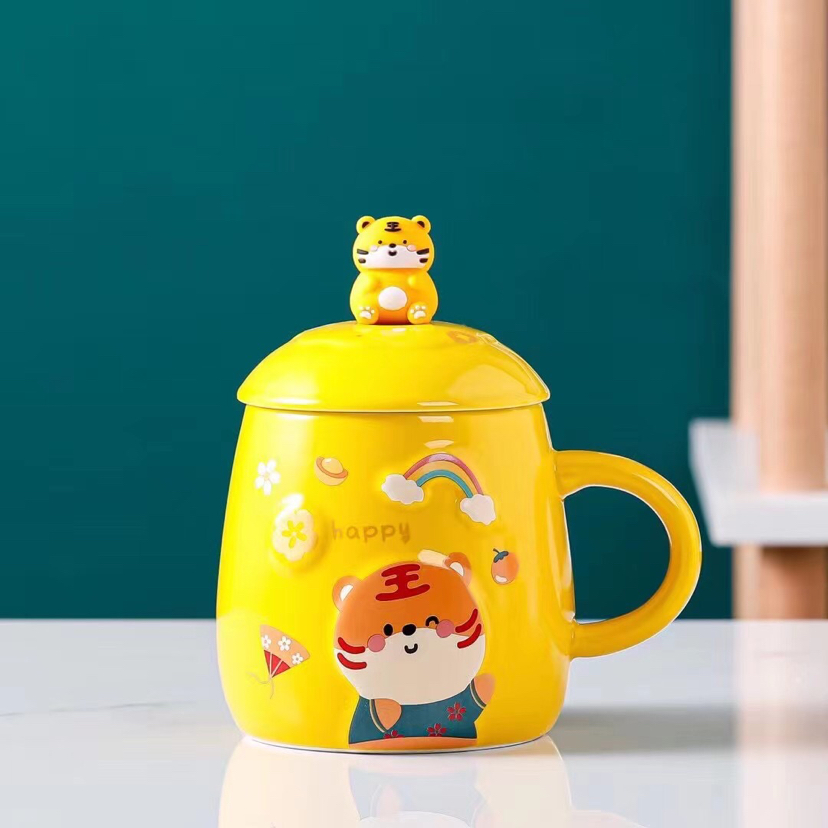 Hot Sale Cartoon Chinese Zodiac Signs Tiger Ceramic Cup with Cover with Spoon Mug Creative Glass