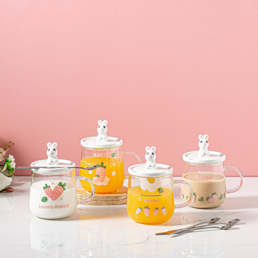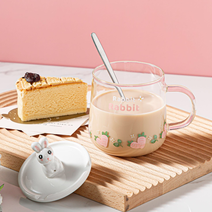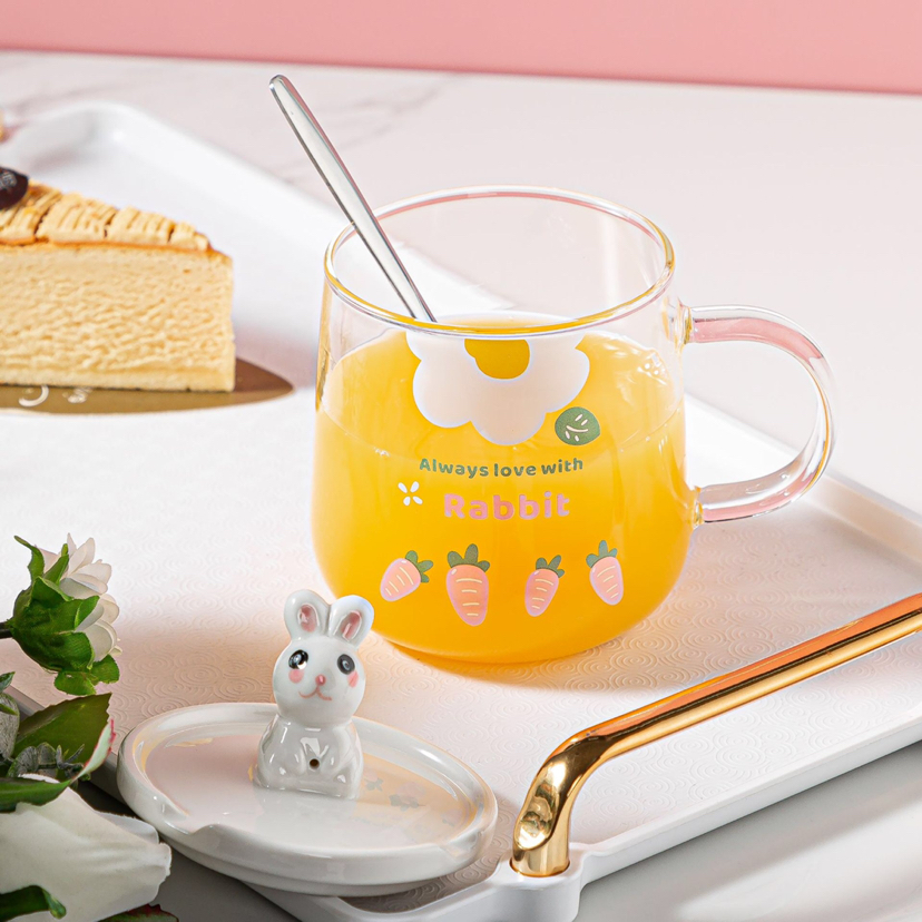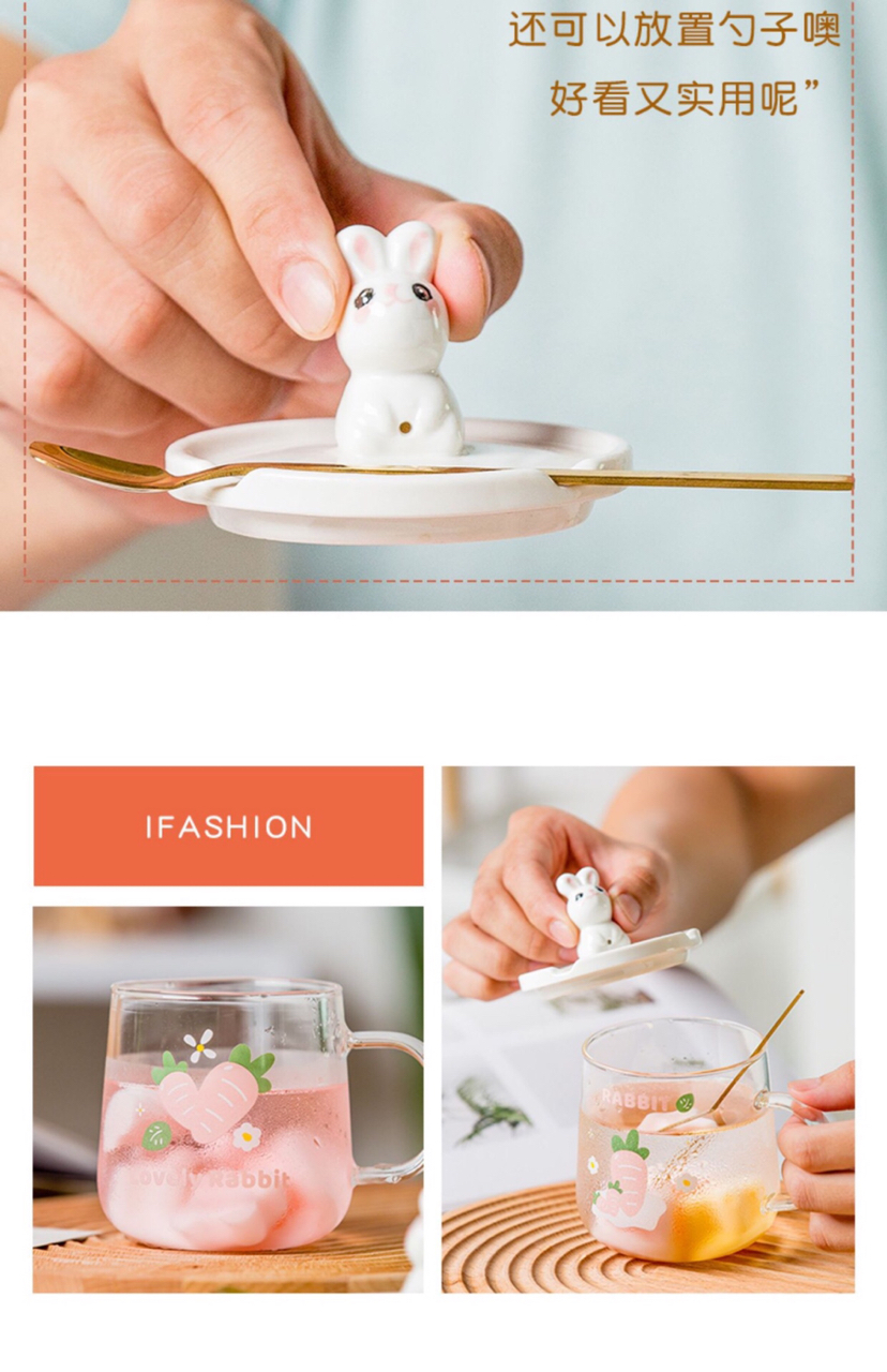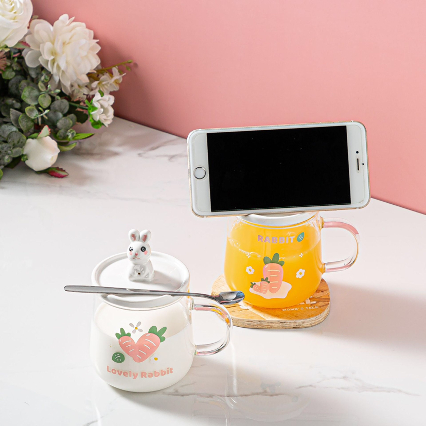 Hot Selling Cartoon Rabbit Heat-Resistance Glass Transparent Scented Tea Cup with Cover with Spoon Mobile Phone Holder Mug