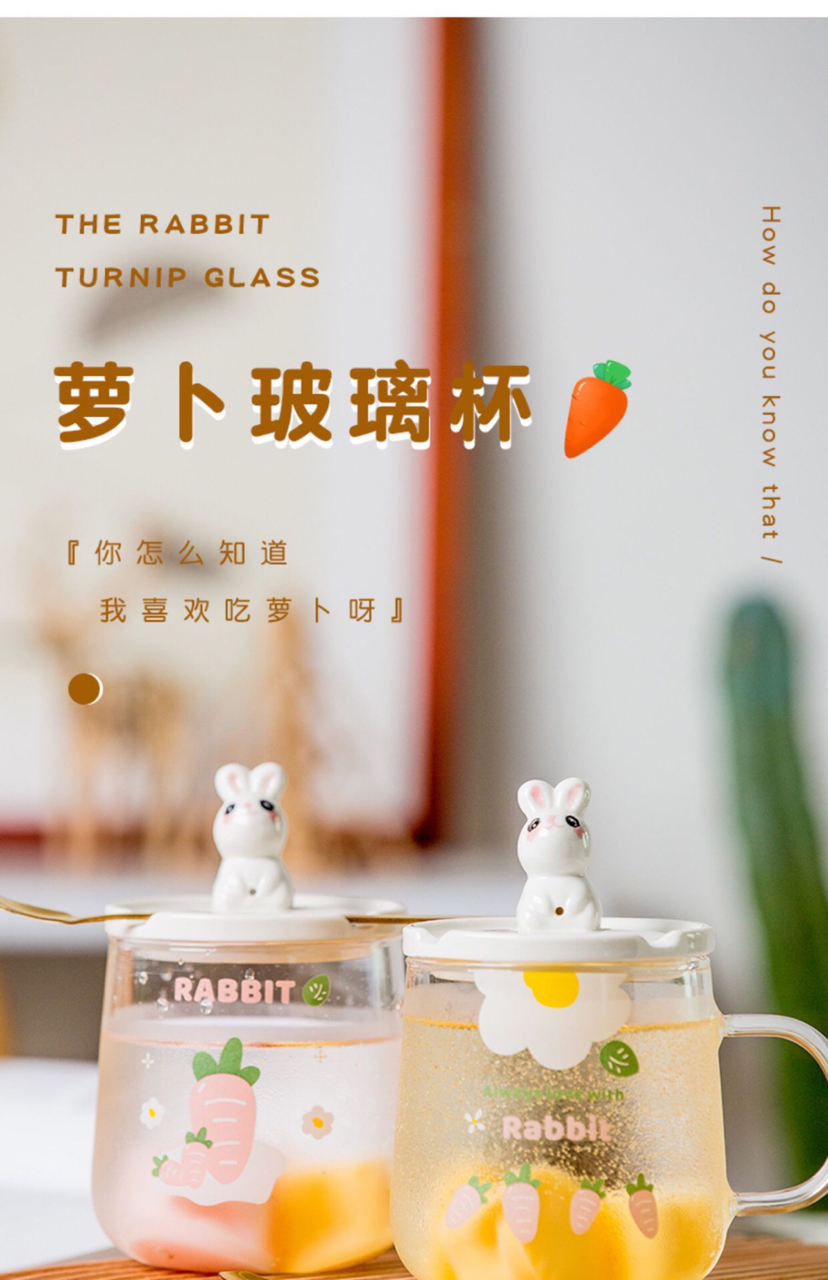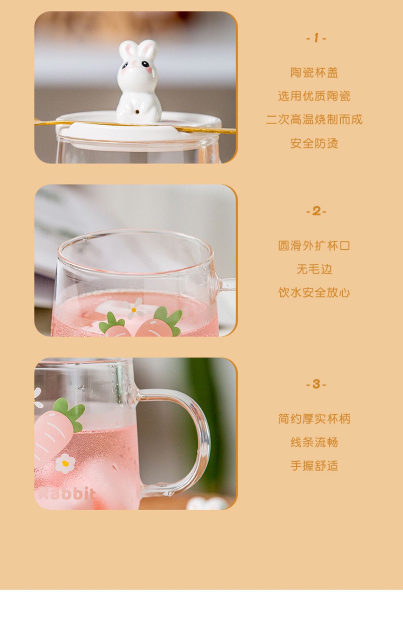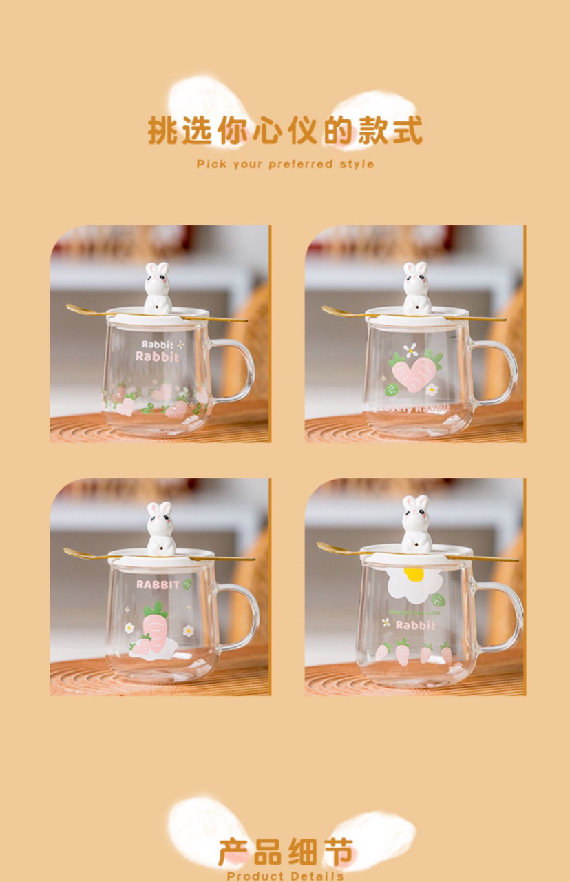 Hot Selling Cartoon Rabbit Heat-Resistance Glass Transparent Scented Tea Cup with Cover with Spoon Mobile Phone Holder Mug