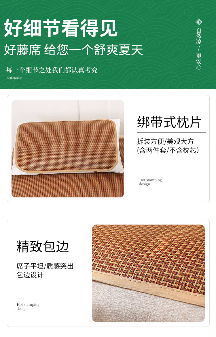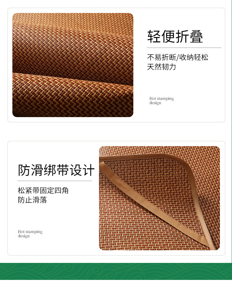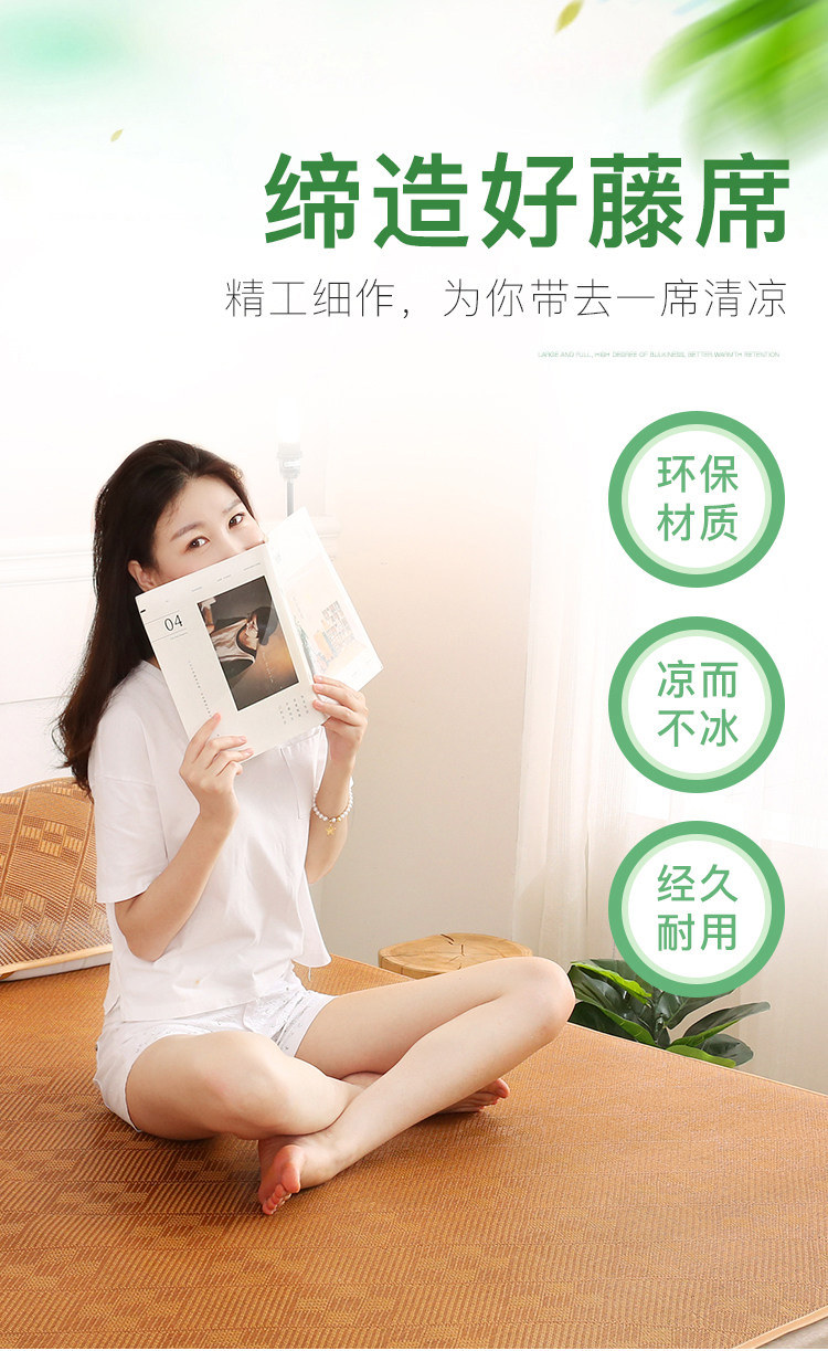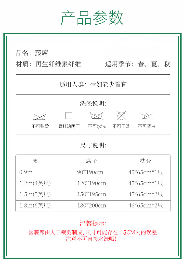 Rattan mats are the kings of mats, combining the coolness of bamboo mats, the softness of grass mats, and more. They are tough, delicate, tightly woven, and durable. This product is manually cut, and there may be about 5cm errors in size, but it will not affect use. [Reminder]: This rattan mat cannot be washed!!! Before use, wipe it clean with a wet cloth, and let it dry in a shady place. Regarding crease issues, due to folding and packing for shipping, there may be creases upon arrival, which is not a quality problem. The creases will return to flat after a few days of use.