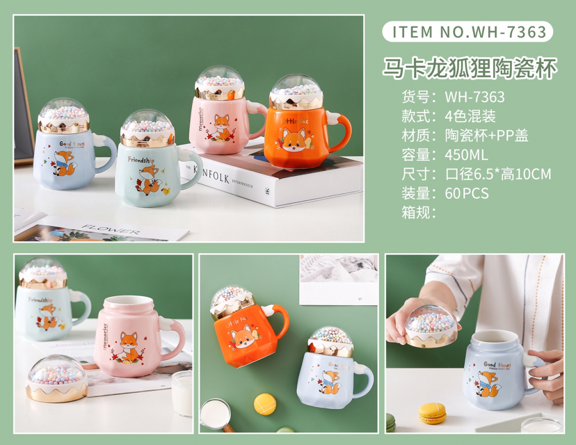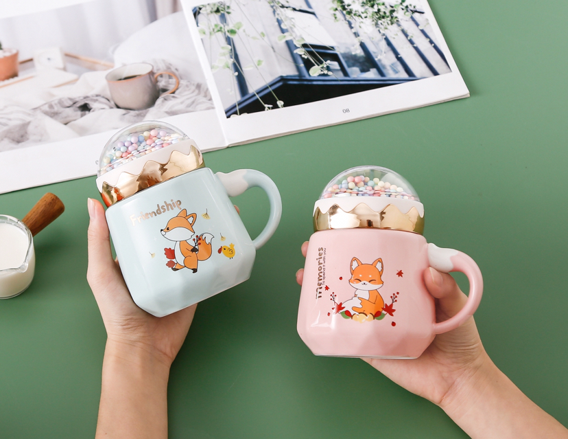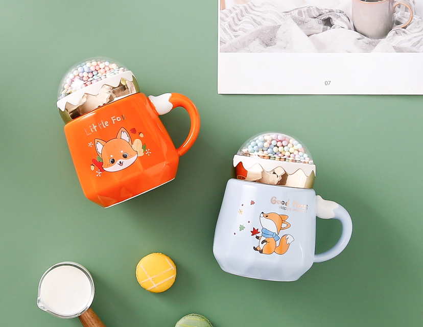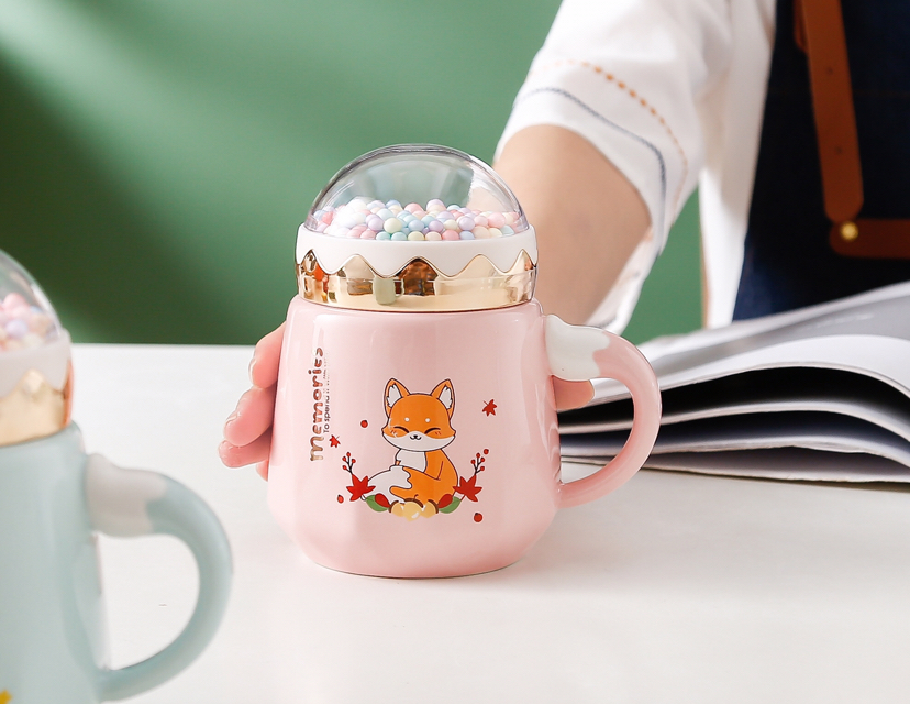 Happy Planet Bead Cover Ceramic Cup Cartoon Animal Fox Mug with Lid Office Water Glass