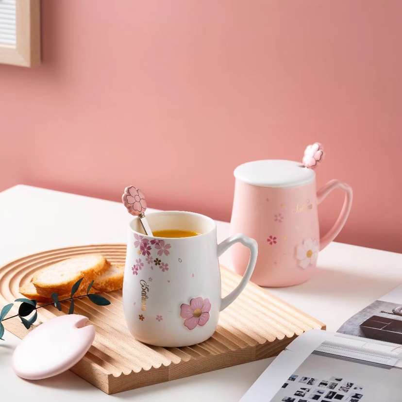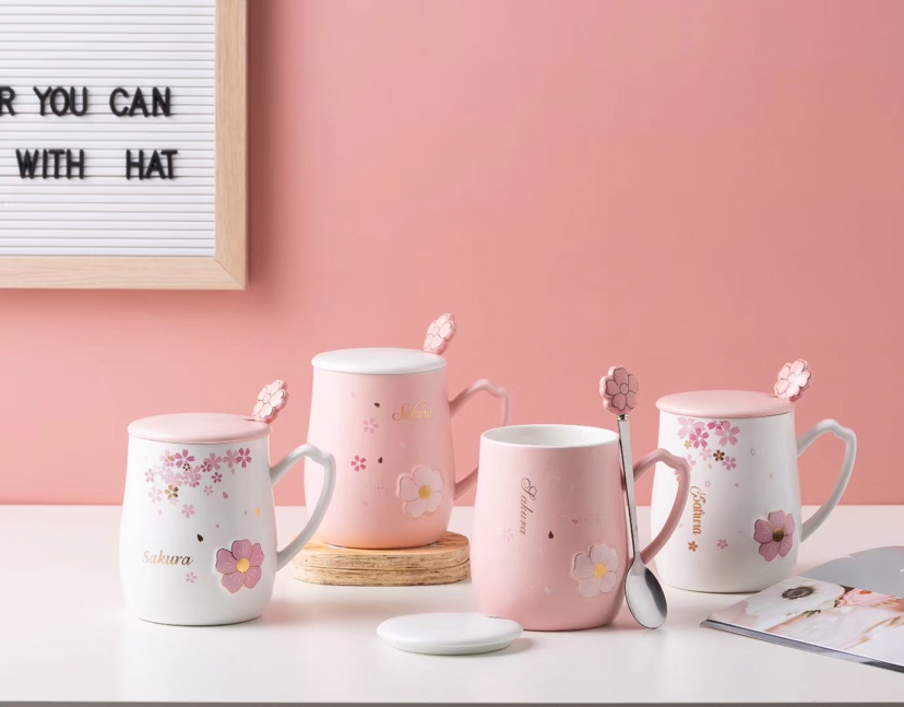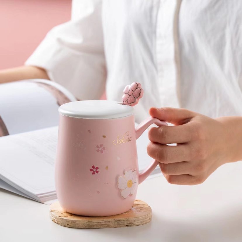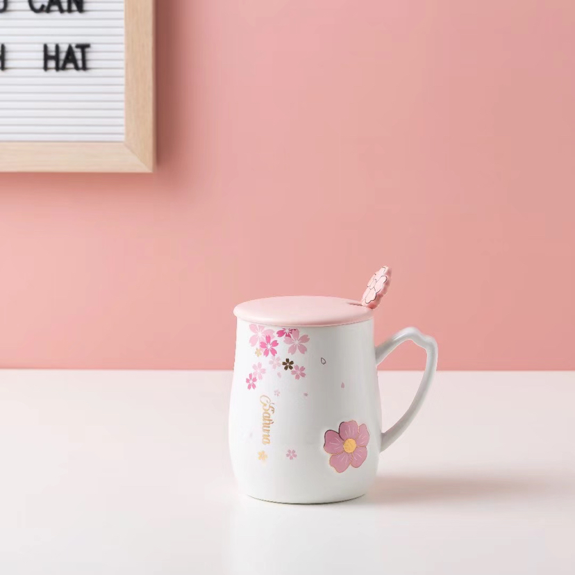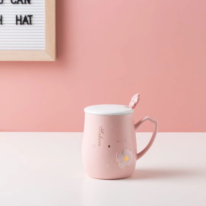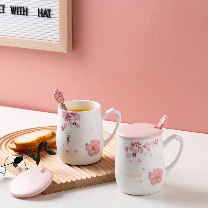 Pink Girl Cherry Blossom Ceramic Cup with Cover with Spoon Mug Cute Water Glass Office Coffee Cup