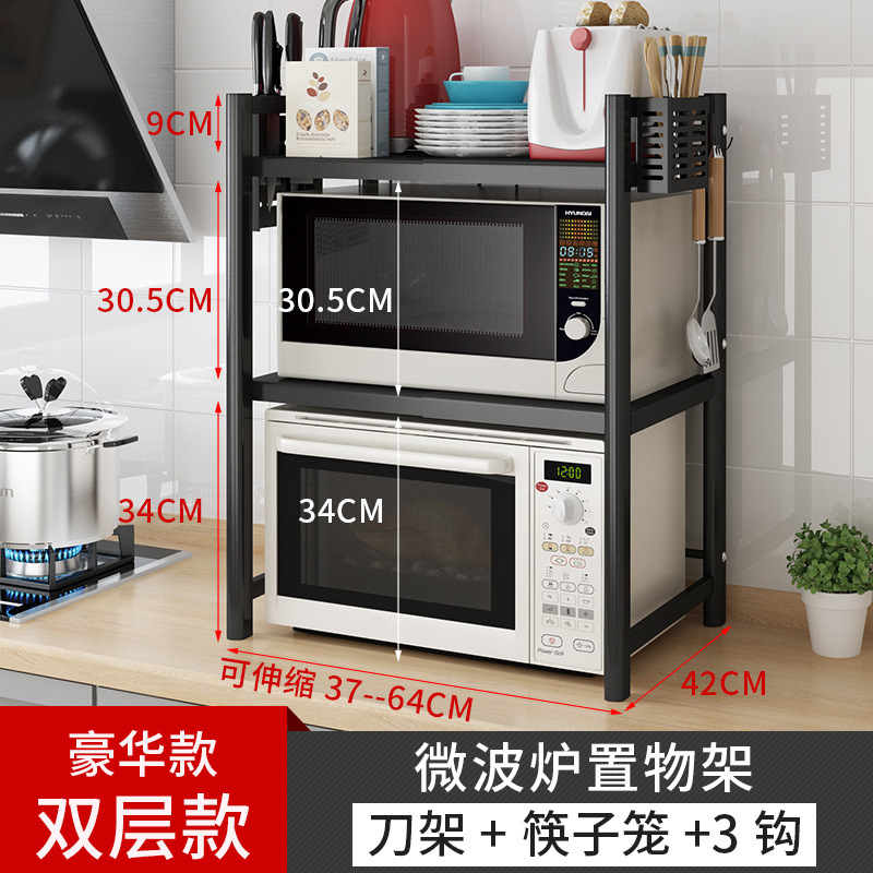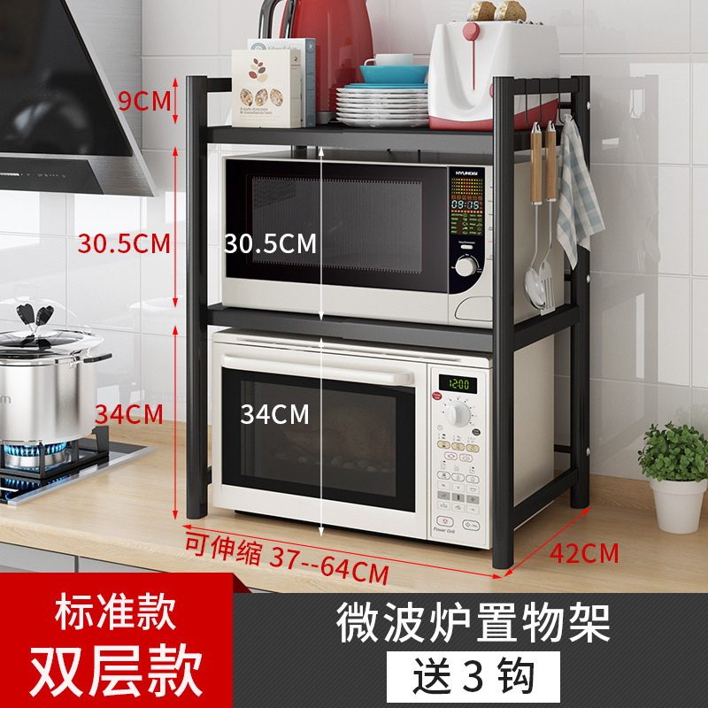 [extra thick-black] double-layer microwave rack +3 hooks (retractable 37-64cm)