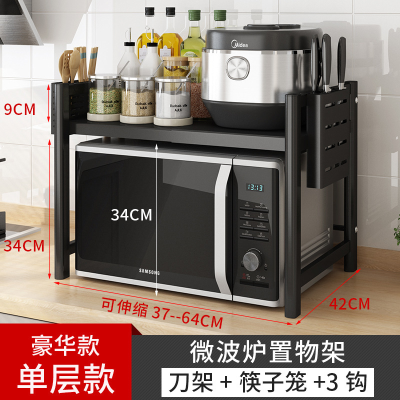 [extra thick-black] single-layer microwave oven rack + chopsticks box + knife rest +3 hooks (retractable 37-64cm)