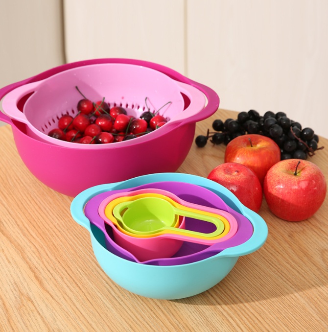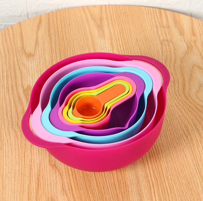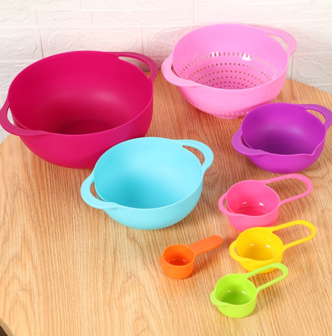 About Product:Creative Kitchen Tools Rainbow Eight-Piece Set Storage Pot Drain Screen Size Water Bowl Measuring Spoon