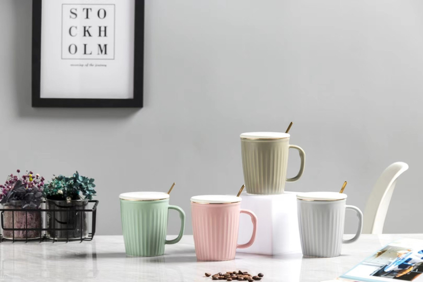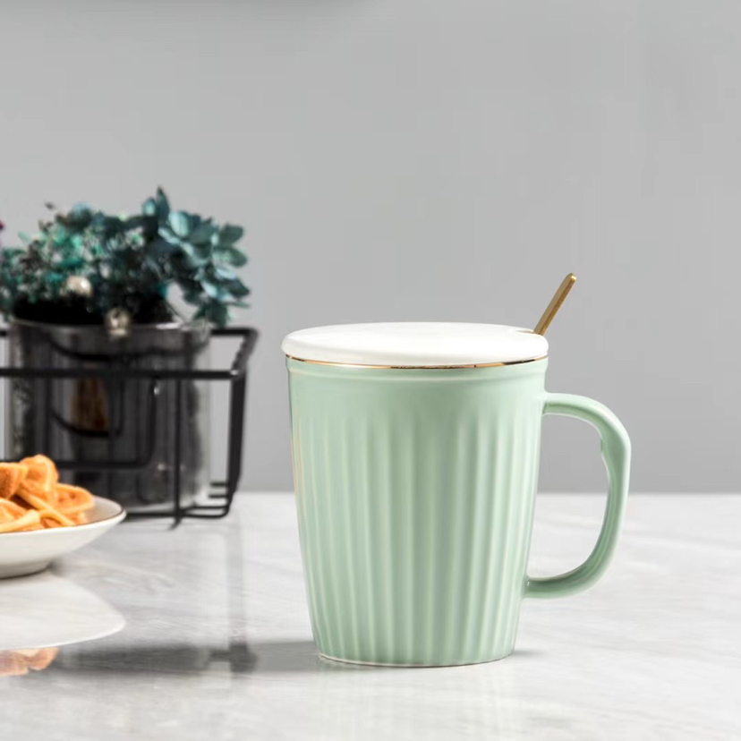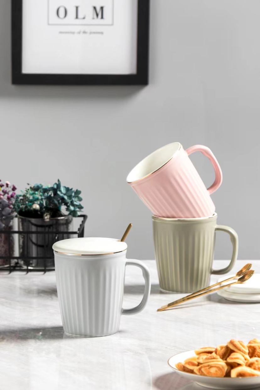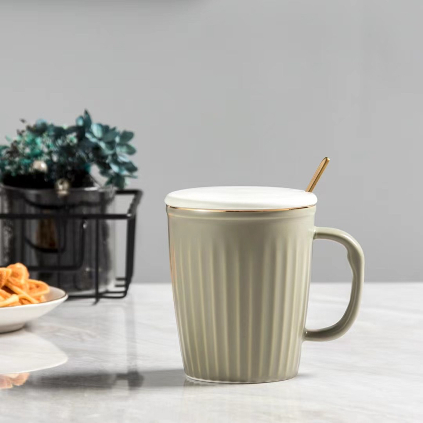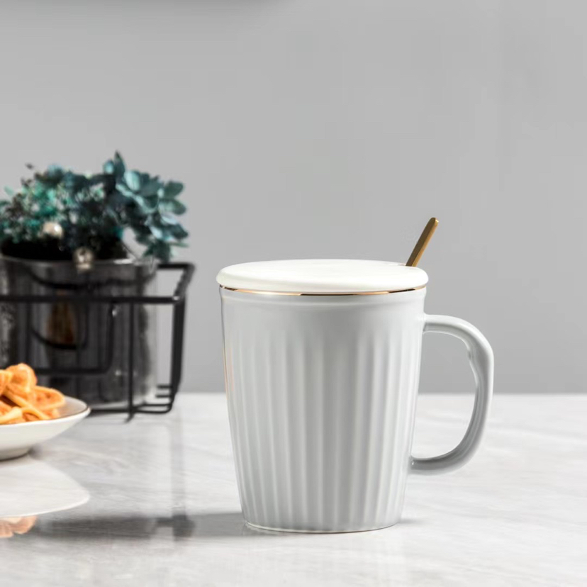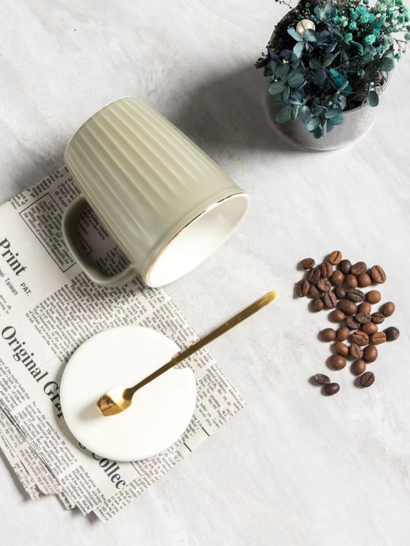Nordic Light Luxury Vertical Stripes Ceramic Cup Gold Design Mug with Cover Spoon Coffee Cup