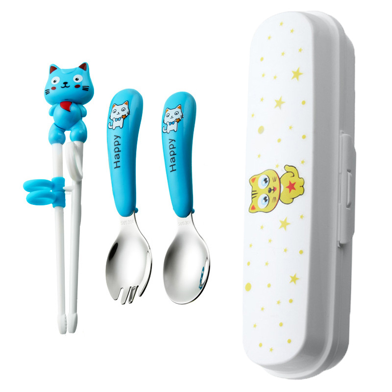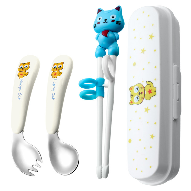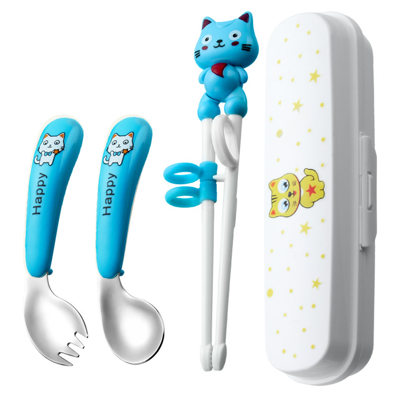 white cat-blue-fork spoon and chopsticks-color box