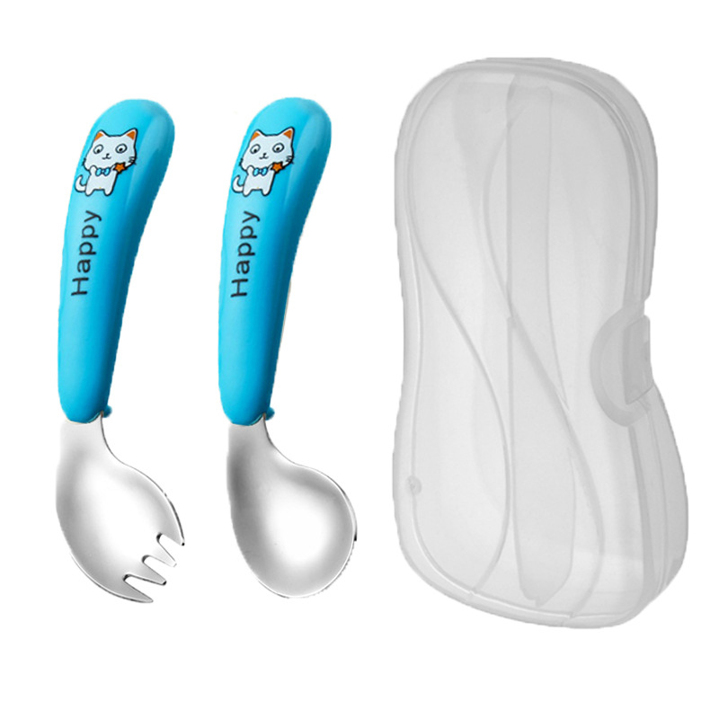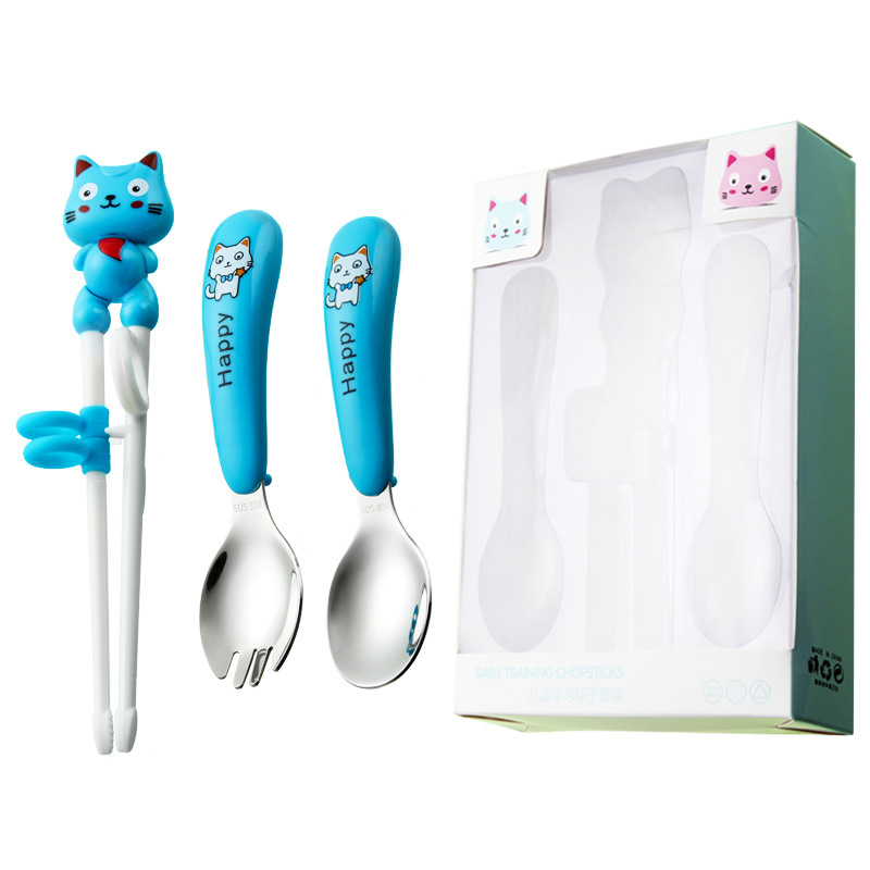 white cat-blue-curved fork spoon and chopsticks-white box